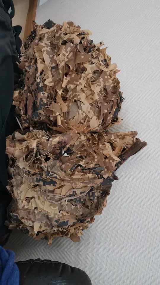 Цвет хороший, шуршит вмеру, бликует несильно , легкая. Армирована капроновой сеткой где то 10х10 см. Сетка и ткань не соединены, но это легко решаемо. По краям лямки. Для охоты подойдет. За свои деньги хорошая вещь.