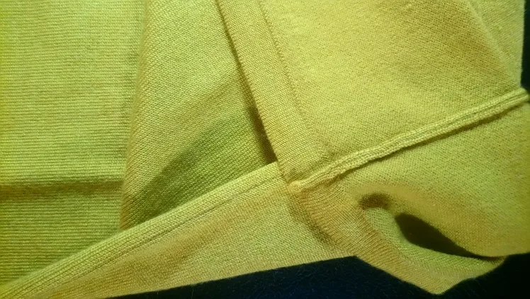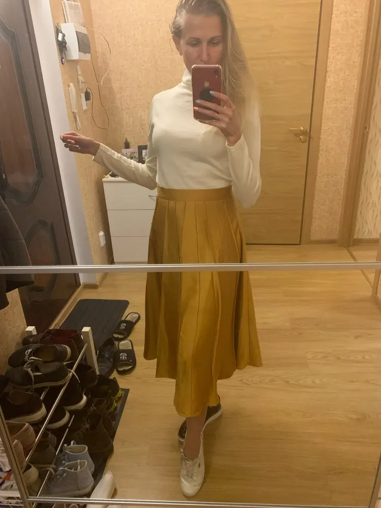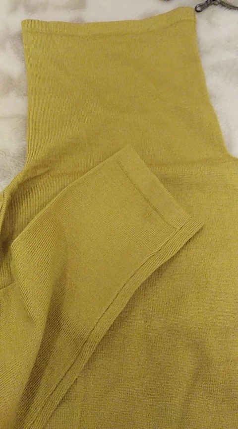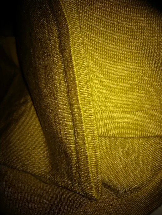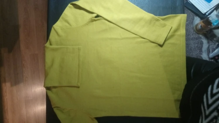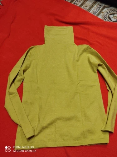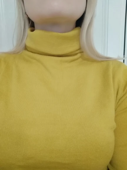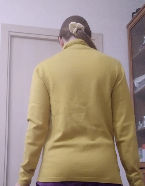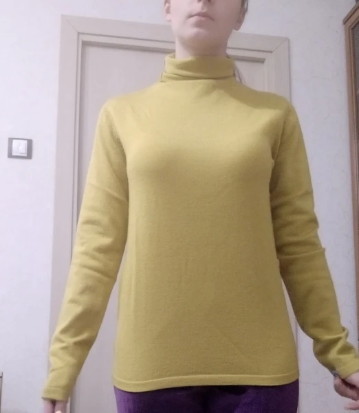 Хорошая водолазка с шерстью в составе. Цвет не совсем желтый, мне показалось, что даже в зелёный отдает, но фото этого не передало. На параметры 84,5-63,5-91 и рост 154 см размер L сел свободно, но рукава очень длинные для моего роста. Водолазка немного колется, так как с шерстью, но состав отличный. Доставка заняла около 2 недель до СПб. Покупала по наводке Галины _gravitsappa_. Стоила примерно 760 руб. с купонами