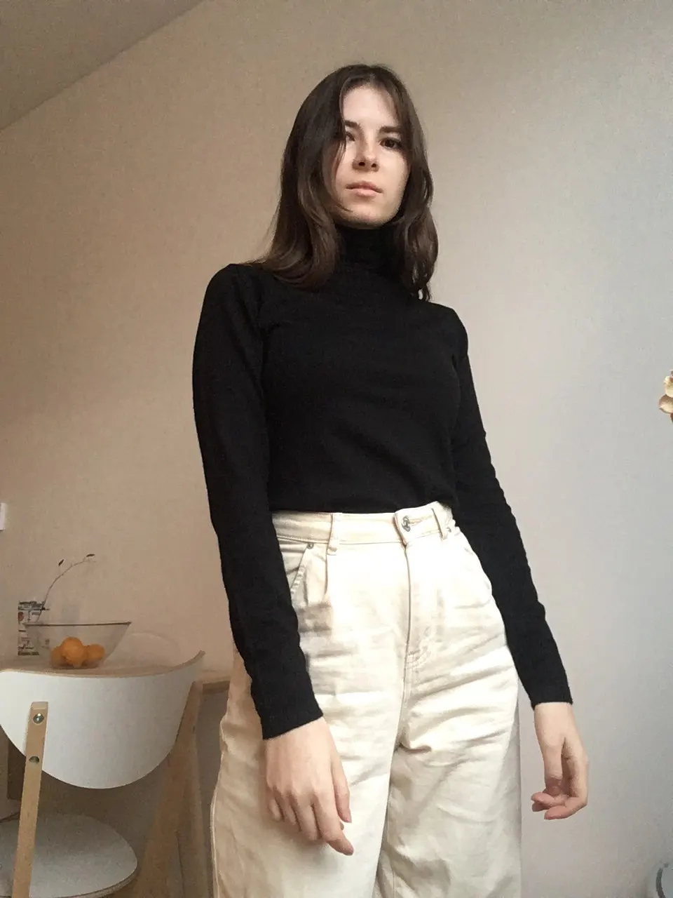 Водолазка на качество хороша. Тёпленькая. Цвет слоновой кости. Размер S мне подошёл. Я 47 кг, рост 152 см, ОГ 85, ОТ 65 см. Единственное смущает такая гармошка на шее. Рекомендую! Продавец отправил сразу.