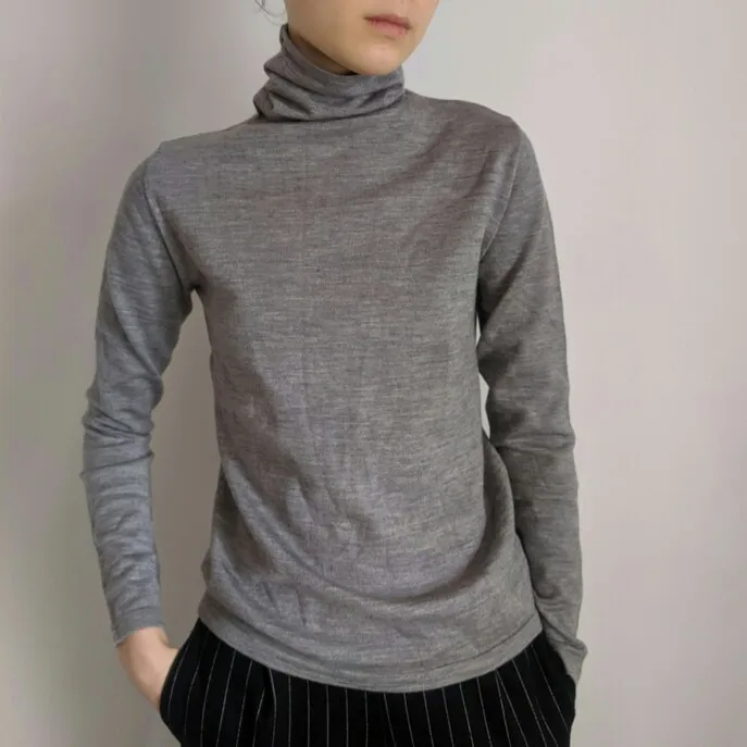 Идеальная водолазка!! Шерсть ощущается даже руками, при этом мягкая. Цвет немного холоднее (что великолепно), чем на фото продавца. Сидит приятно свободно, плечи 40, рост 173, талия 78. Не короткая, то, что нужно. Спасибо брэнду за продукт!!!