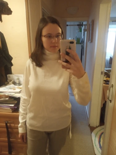 Неплохая водолазка, теплая, в составе шерсть, и она ощущается небольшим покалыванием. Цвет не белый, а ближе к слоновой кости, и мне он очень понравился. На параметры 84-67-96 размер L сел хорошо, свободно. Но можно было и М взять, наверное. К вороту, конечно, надо приноровиться. На рост 163 может, рукава чуть длинноваты. К сожалению, водолазка пришла с пятнами на рукаве, и, такое чувство, что ее уже мерили или даже носили, хотя все этикетки были на месте. Открыла спор, мне вернули часть денег.