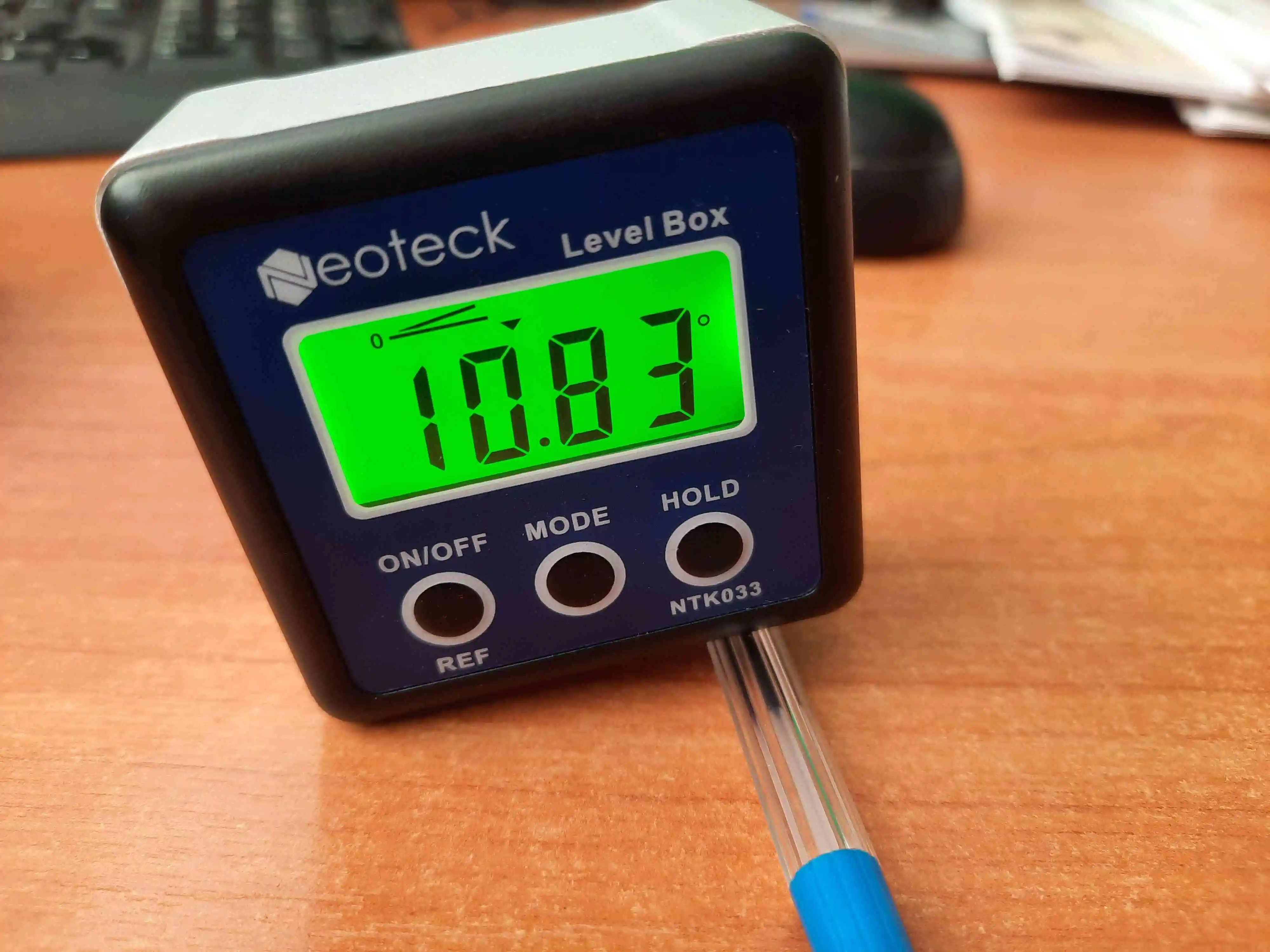 Через 4 дня с момента заказа заказ был уже на руках. Доставка на дом курьером. Батарейки в комплекте, закупать отдельно не требуется. On/Off - включение/выключение. Mоde - режим измерения (градусы, миллиметры, %...) Hold - фиксация показаний на дисплее. Есть встроенный магнит в нижней части прибора.