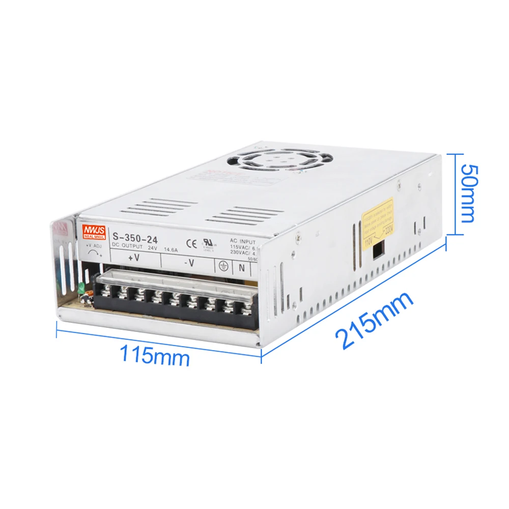 Параметры источника питания: Модель:S-350-24Номинальная нагрузка:350 Вт (максимальная нагрузка)Входное напряжение:AC100-120V/200-245VAC 50/60HzВыходное напряжение:DC24V (постоянное напряжение)Выходной ток:14.6AЭффективность преобразования:Более 80%Рабочая температура:-30 ~ + 50IP код:IP20Тип охлаждения:Вентилятор охлаждения (вентилятор работает с небольшим шумом)Сертификат:CE, ROHS