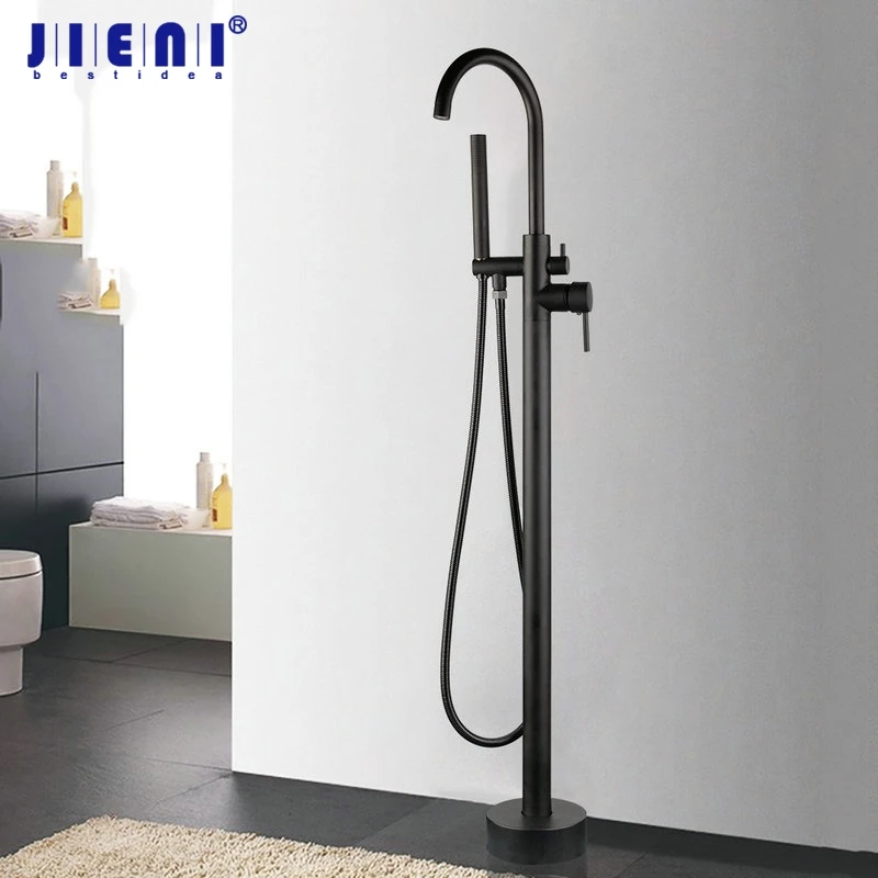 JIENI матовый черный высокий подъем круглый носик смеситель для ванны напольное крепление ванна Наполнитель душ Римский смеситель для ванны набор напольная подставка для душа