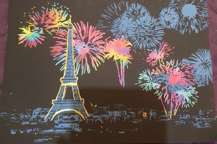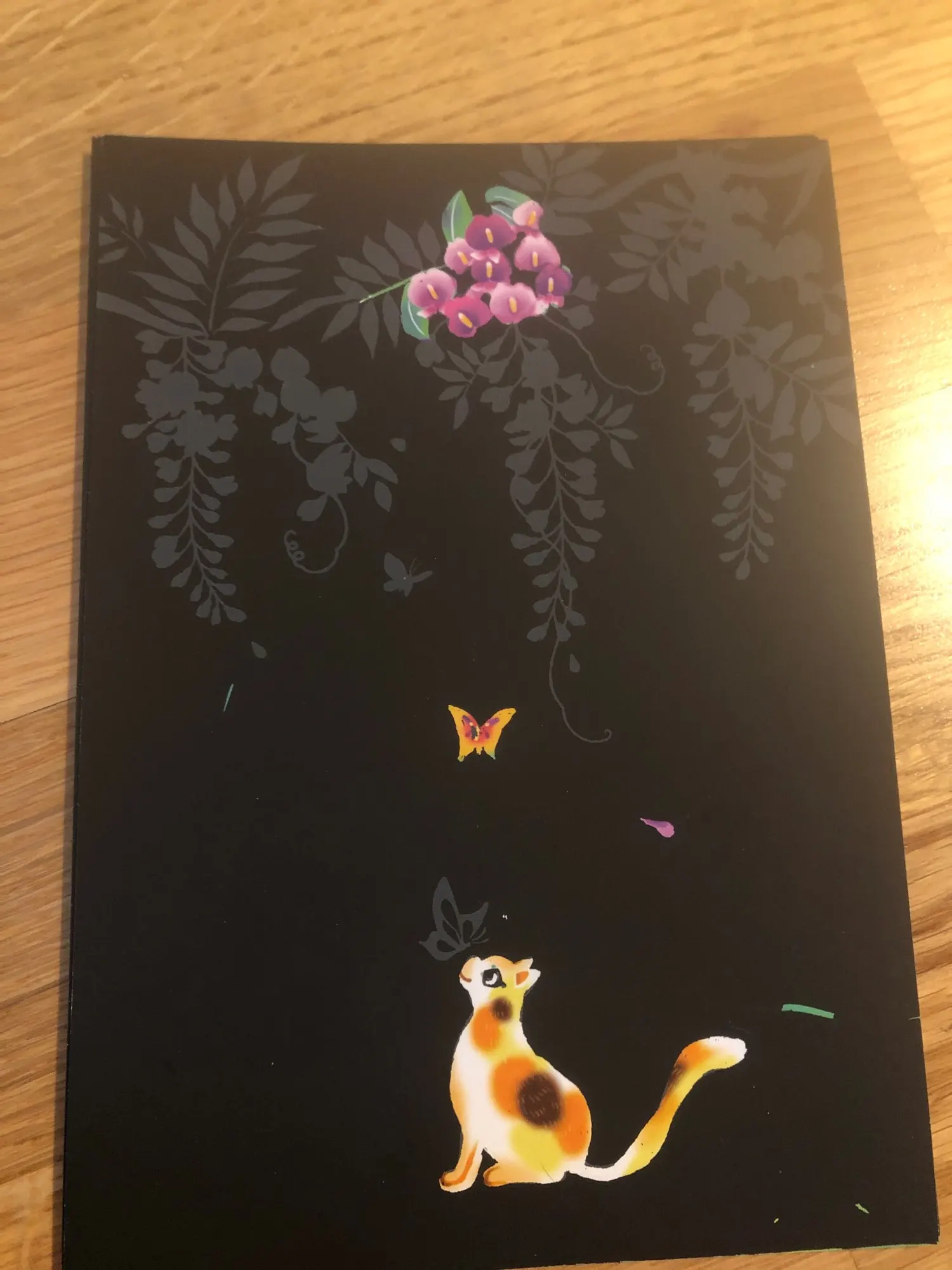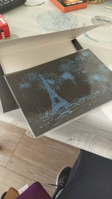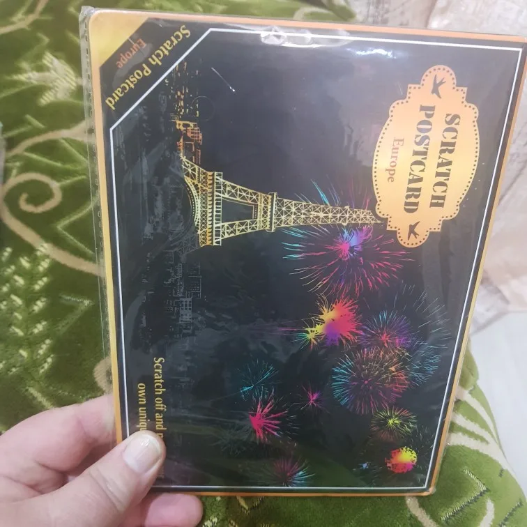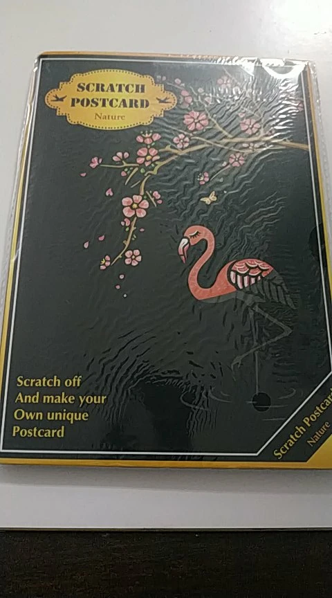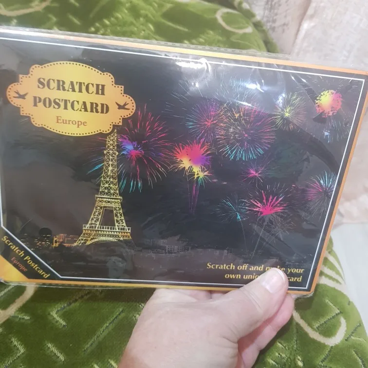 Заказ получен во Франции в течение 3 недель. В комплект входит деревянная палочка для царапин и 4 когтеточки. Детали для царапин окрашены в синий цвет и хорошо видны. Упаковка аккуратная. Задняя часть каждой карты печатается так, как будто это была открытка, чтобы мы могли написать слово. Формат соответствует формату листа A5.