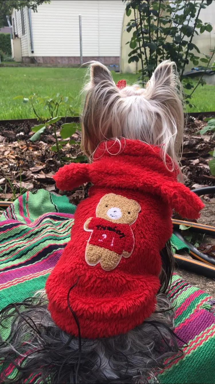 Доставка в Беларусь 2 недели. Очень хорошая кофточка, беру уже вторую. На йорка 2.300 чуть велика, но зато шерсть не так колтунит