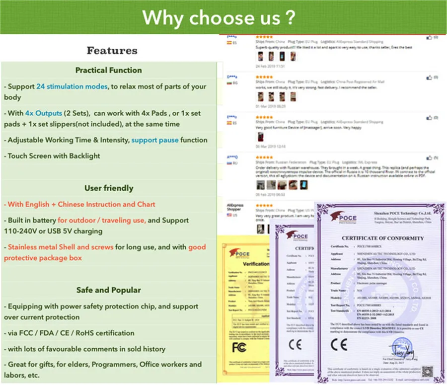 I haven't tested it very much, but I can say that it looks like a good device. I tried a few functions and it works well. The current sent to the electrodes is quite strong. Read the manual carefully and use this device efficiently. Great attention !!! Do not use near the heart. It is not allowed to use stimulation electrodes on the side front of chest (marked by ribs and sternum), especially in the two large pectorals. It can increase here risk of fibrillation and may cause cardiac arrest. There are several contraindications that I know from another device I had before.