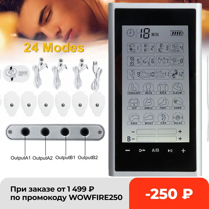 Пользуюсь почти 3 недели. Классная штука, мышцы ей не накачаешь, только растормошишь. Но, для релаксации и облегчения боли очень даже подходит. Работает хорошо, экран быстро гаснет. Есть блокировка, чтобы случайно не нажать куда не нужно)) При переключении на другую программу, интенсивность нужно настраивать заново, но это и хорошо, чтобы не херакнуло неожиданно. А/В- переключение между режимами, например А-спина, В-ноги. Настраиваете нужный режим и выбираете интенсивность. Батарею держит очень долго. Режимов много, все разные. Провода рабочие, комплектация как в описании. К покупке рекомендую, привезли быстро, все целое.