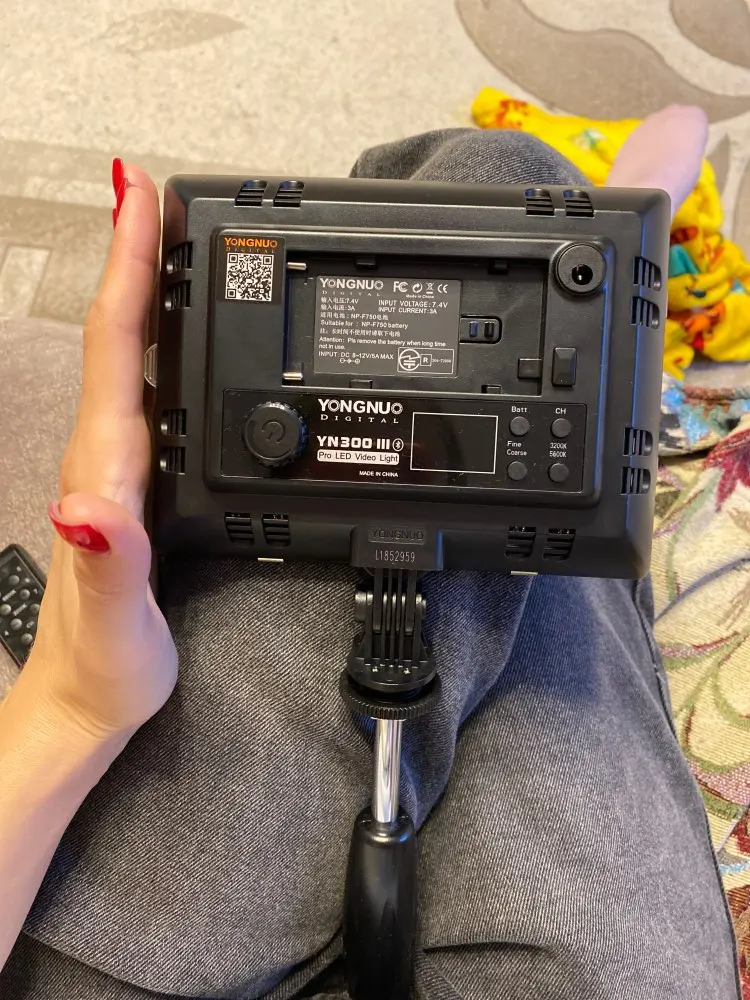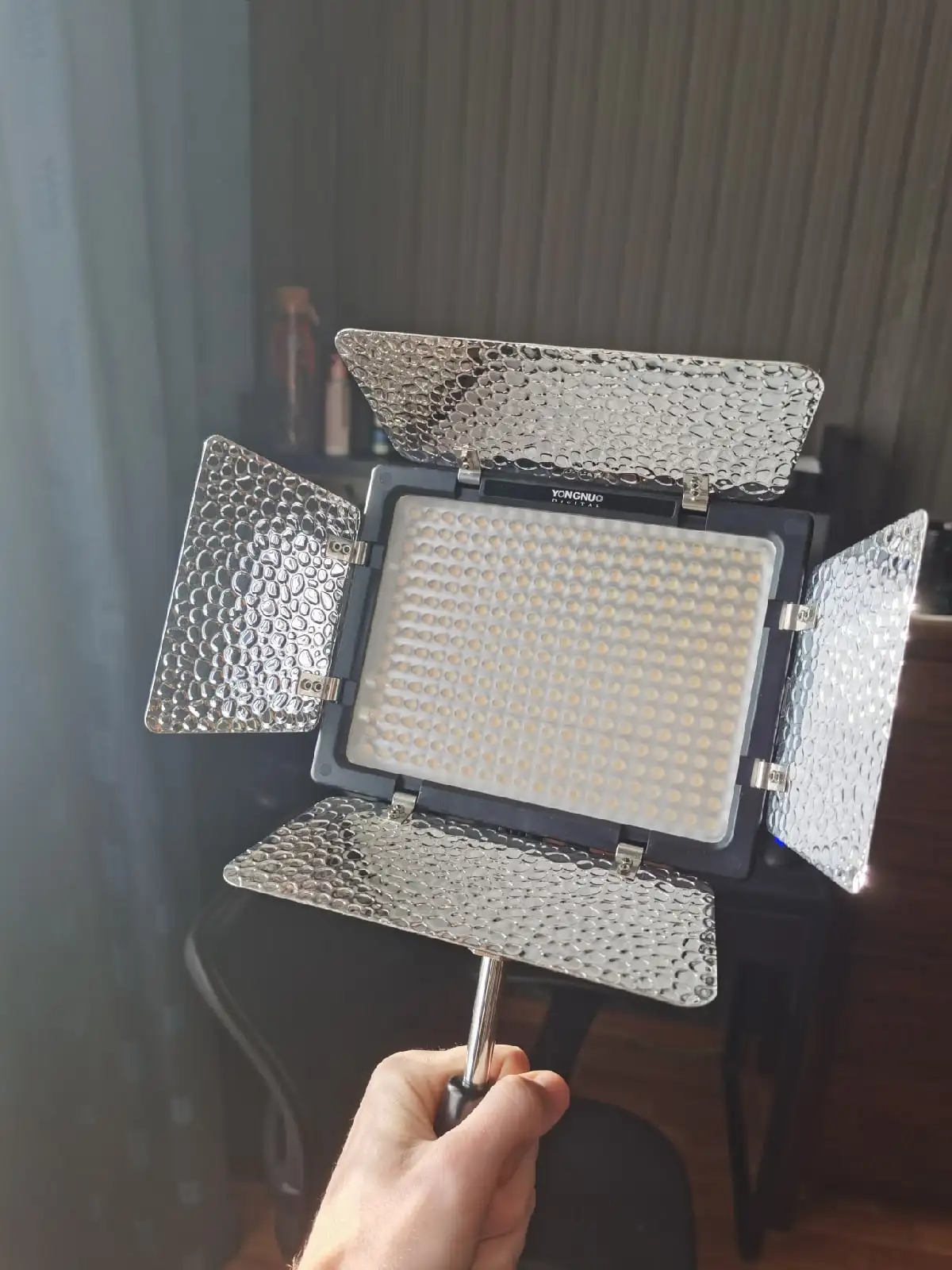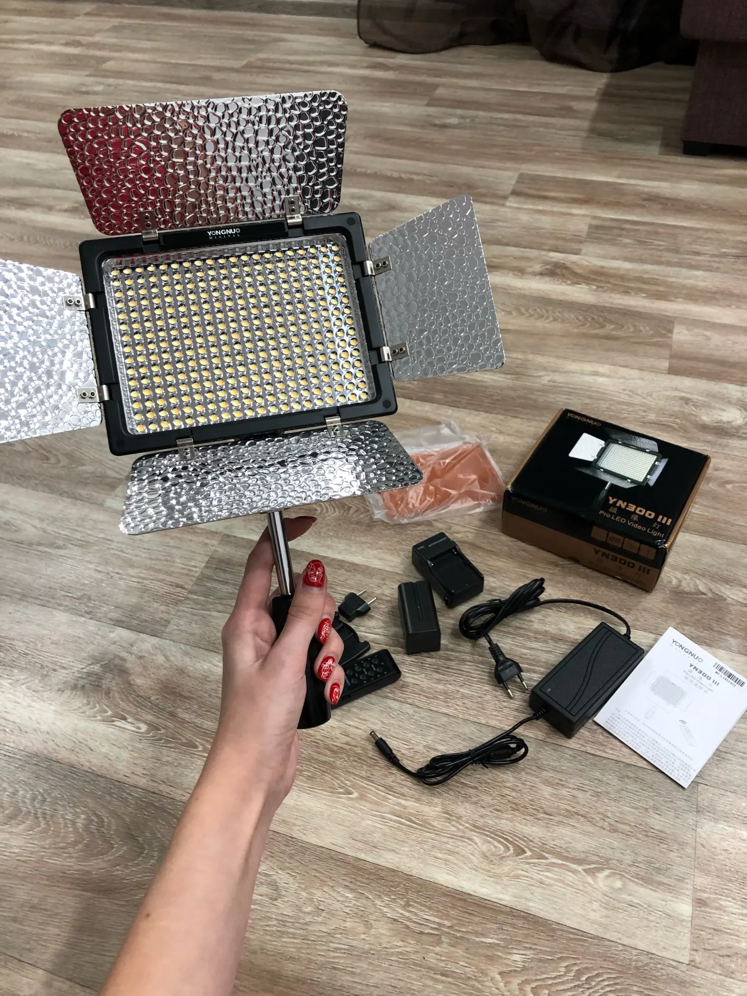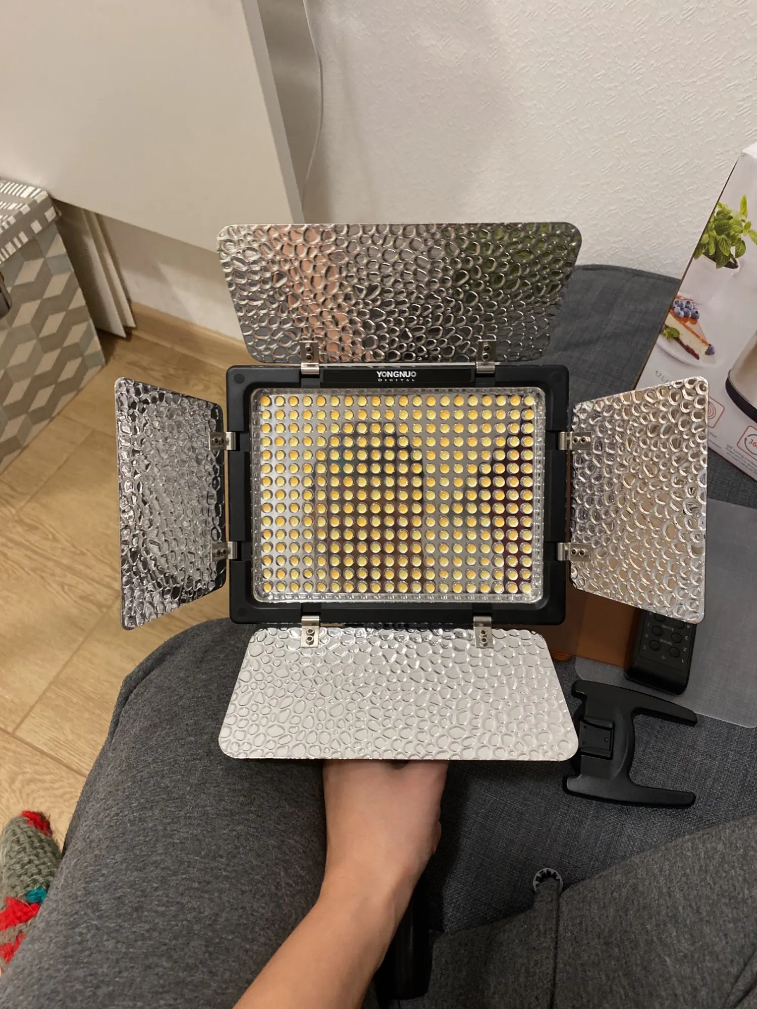 Это огонь в огне. Я взяла самую полную комплектацию. Светит ярко, с насадкой получается полноценный мобильный софтбокс. Можно надеть на камеру, можно поставить на стойку или надеть на ручку. Меняется температура. Меняется мощность. Можно использовать с аккумулятором или от сети.
