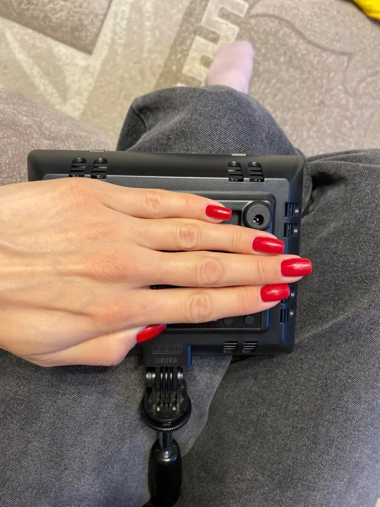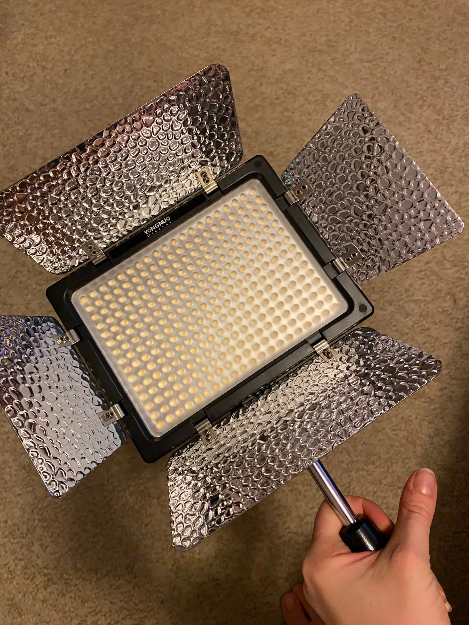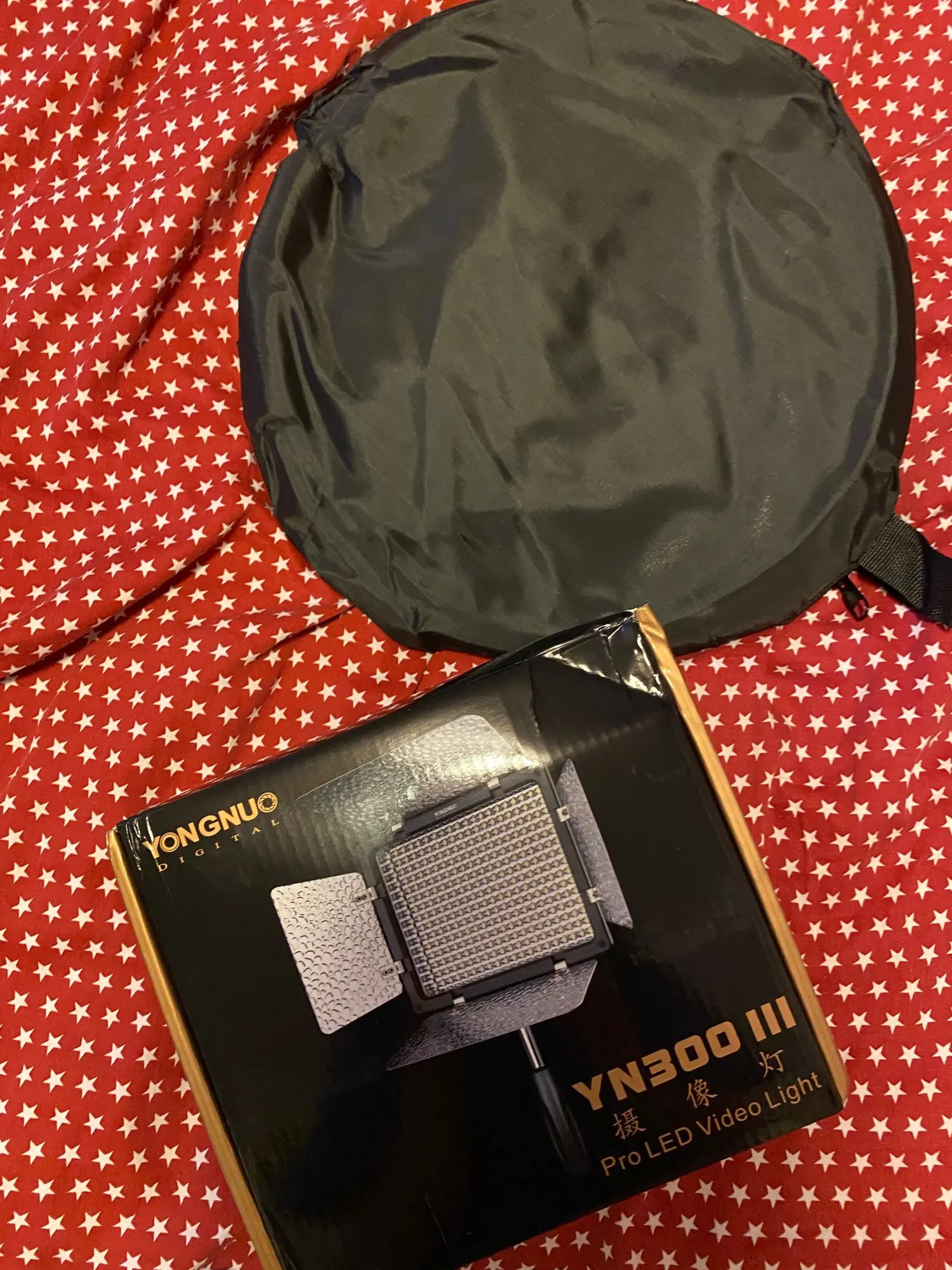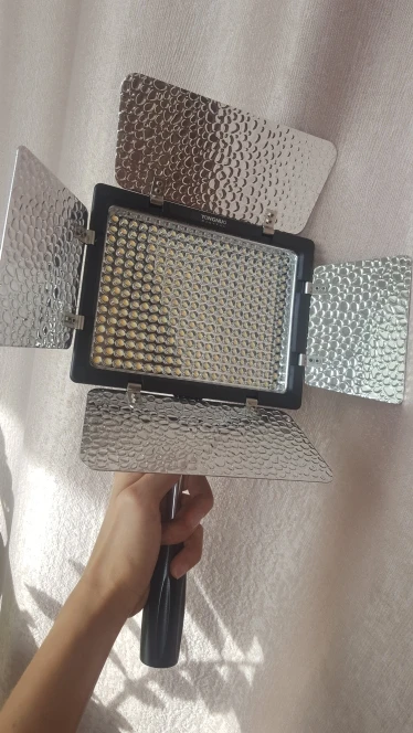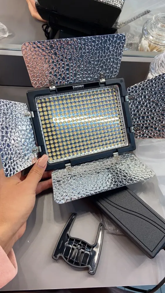 Это огонь в огне. Я взяла самую полную комплектацию. Светит ярко, с насадкой получается полноценный мобильный софтбокс. Можно надеть на камеру, можно поставить на стойку или надеть на ручку. Меняется температура. Меняется мощность. Можно использовать с аккумулятором или от сети.