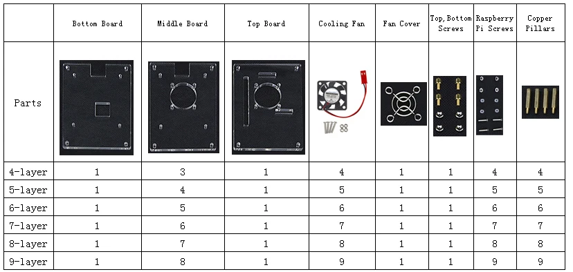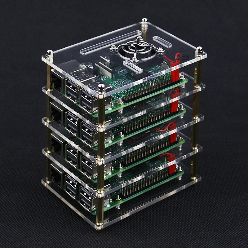 Если вы используете не только один Raspberry Pi, обычный чехол не может удовлетворить ваши потребности. Поэтому мы предоставляем вам чехол для многих слоев. В эта ссылка, вы можете выбрать 4,5... 10 слоев чехол. 1 слой можно поместить в 1 Raspberry Pi. На картинке, мы предоставляем только в 4 слоя чехол для вас. Вы можете добавить его до 9 или даже больше слоев в соответствии с вашими потребностями. Учитывая проблему рассеивания тепла, мы проектируем отверстие для установки охлаждающего вентилятора в каждом слое.
