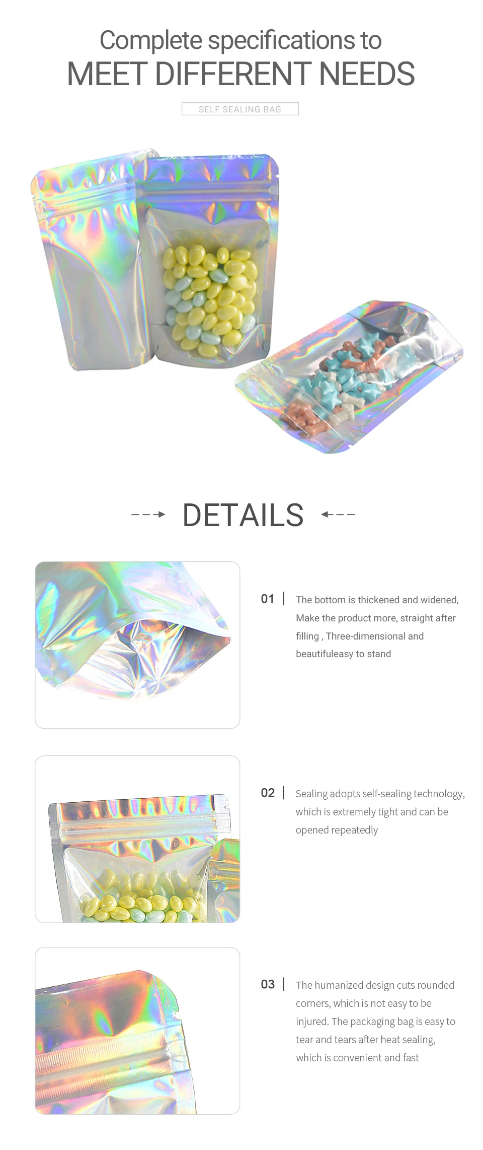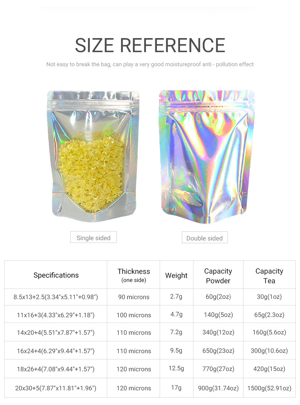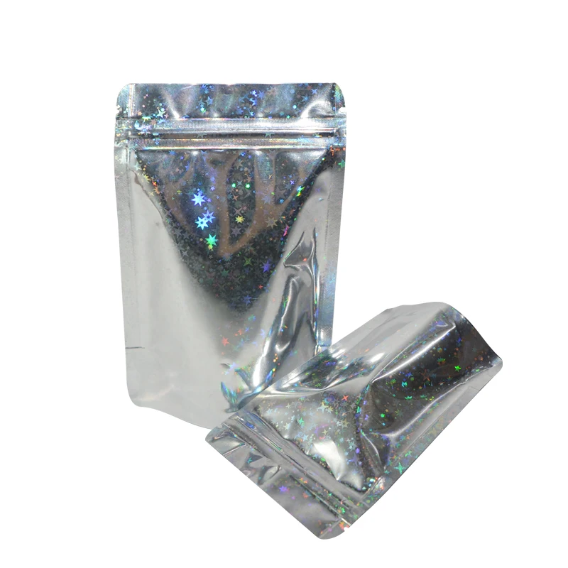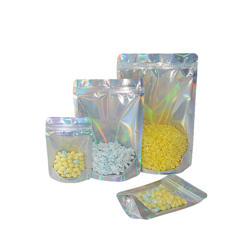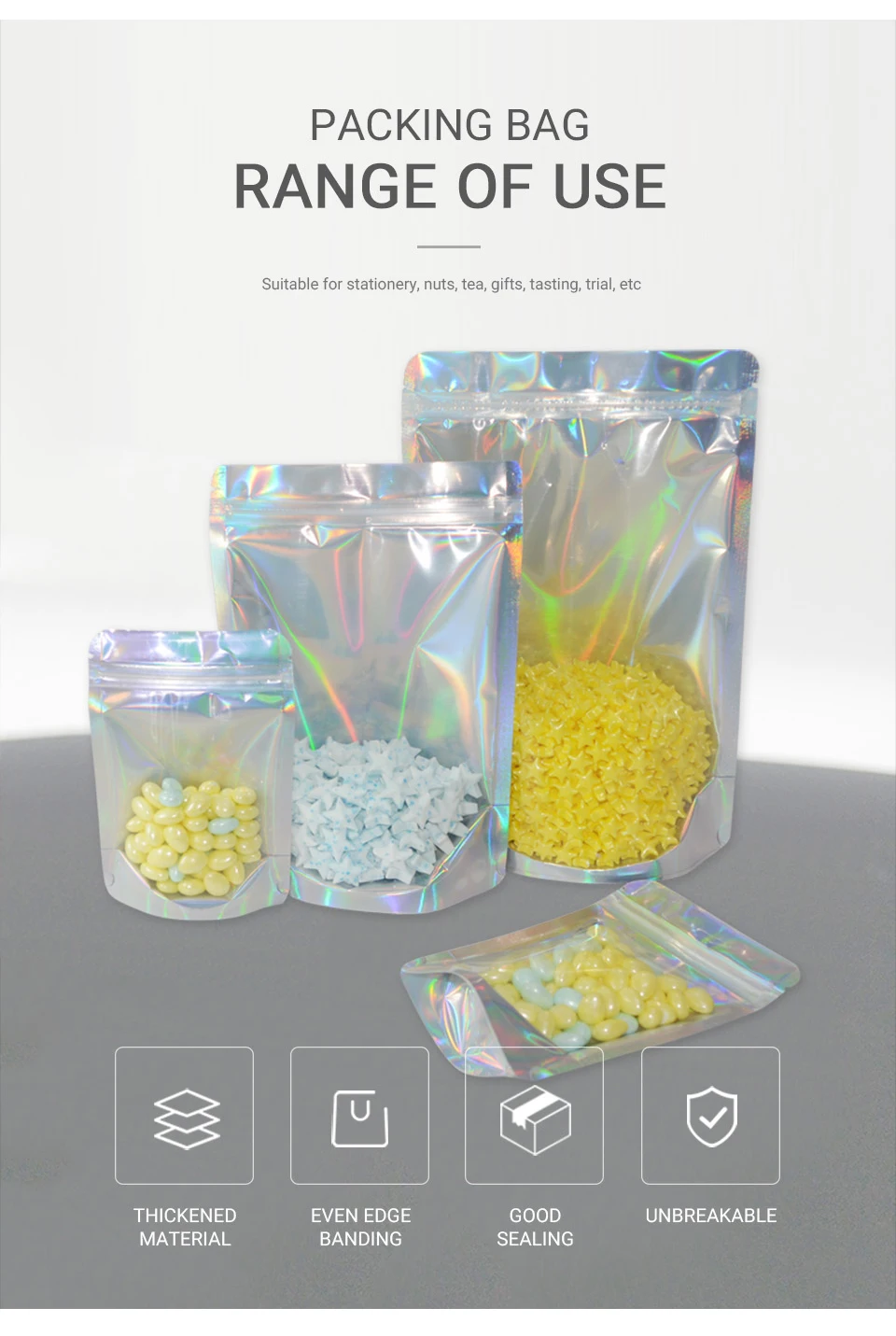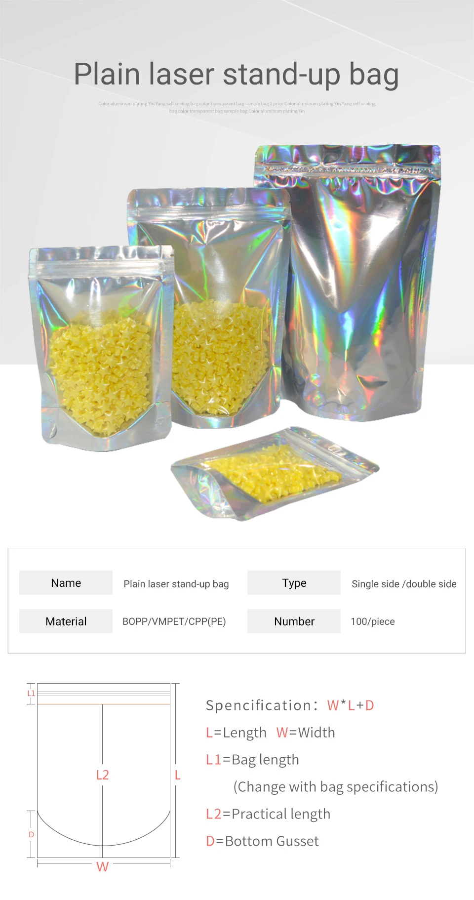 100 шт. Лазерная алюминиевая фольга, перезаряжаемая, стоячая сумка с застежкой-молнией, голографический самоуплотняющийся пластиковый пакет на молнии