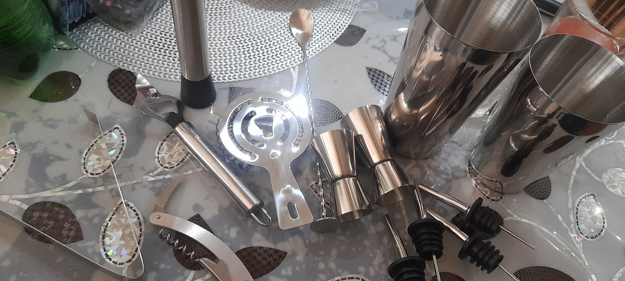 Setshaker , rack, spoon, pourer, straw & ice tong