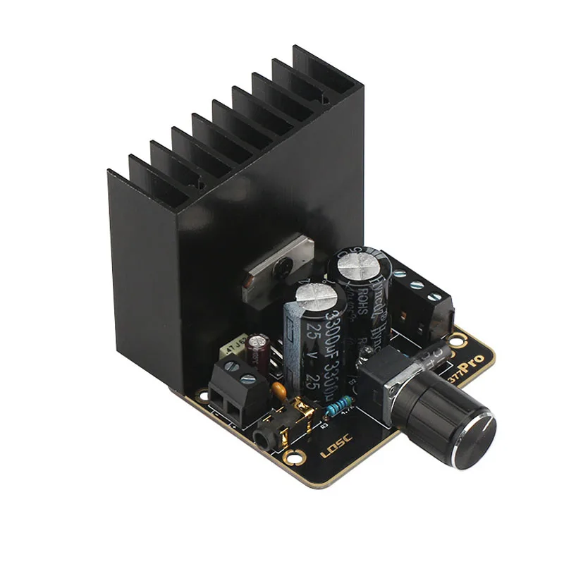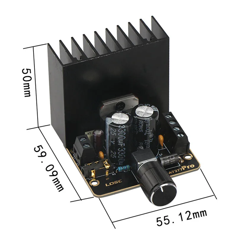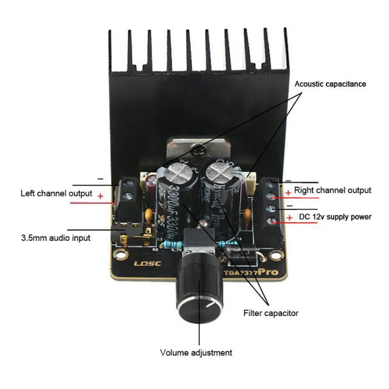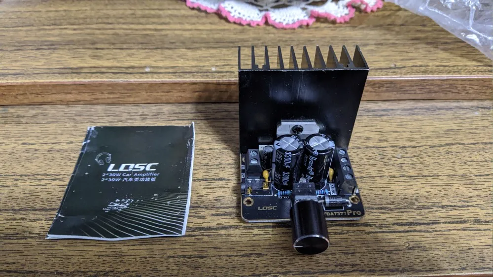 На свои размеры играет отлично. Мои колоноки 12Вт раскачал. Запитан от 12В, потребляет около 1,5-2А. Белого шума нету, как и тресков при вкл/выкл усилителя. За свои деньги - хороший вариант.