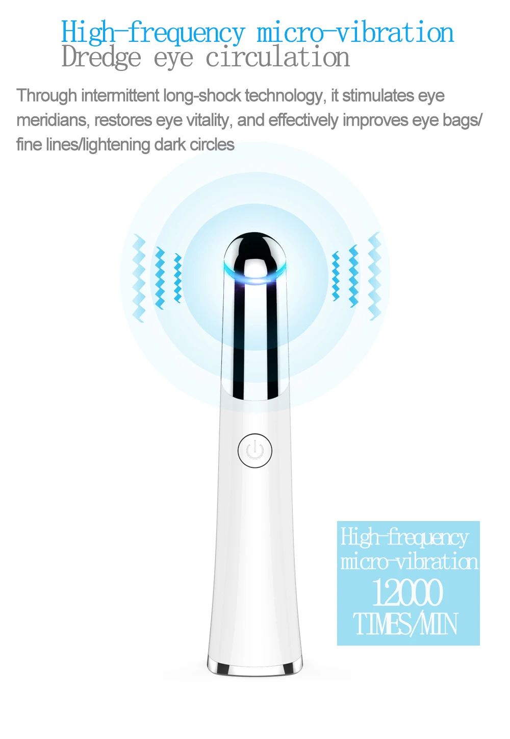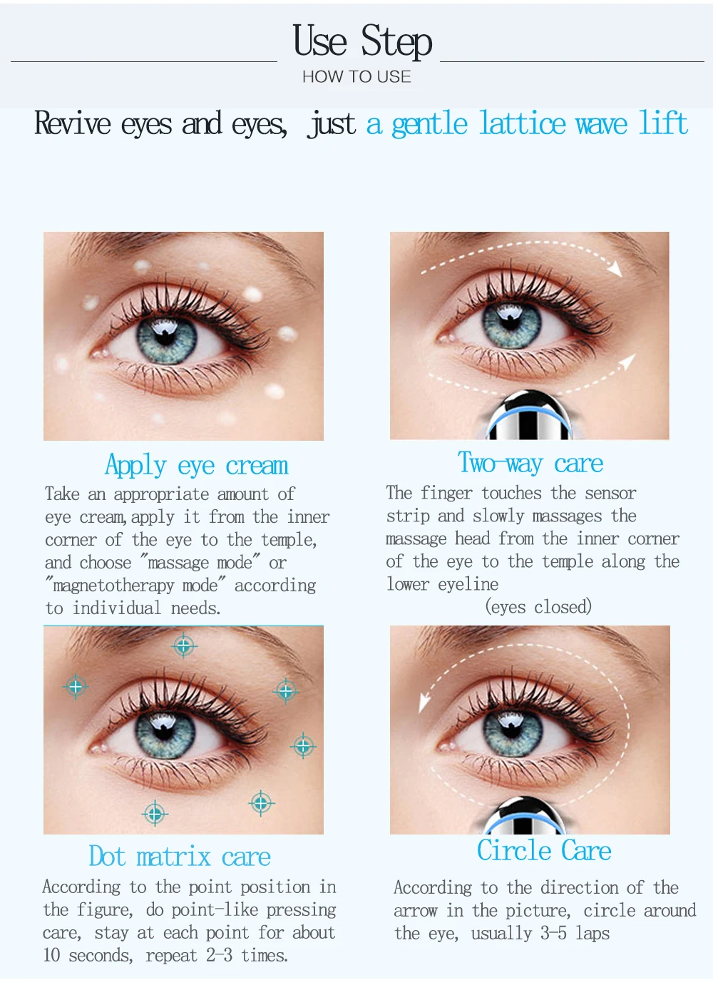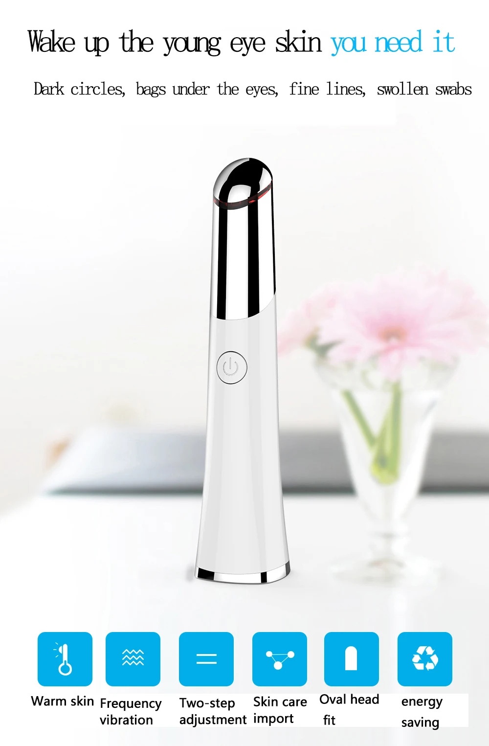 С режимом массажа Blue Light, может снять усталость, помочь коже выводить токсины и устранить отек, может изменить контур глаз и изгиб, а также сделать кожу упругой и упругой.