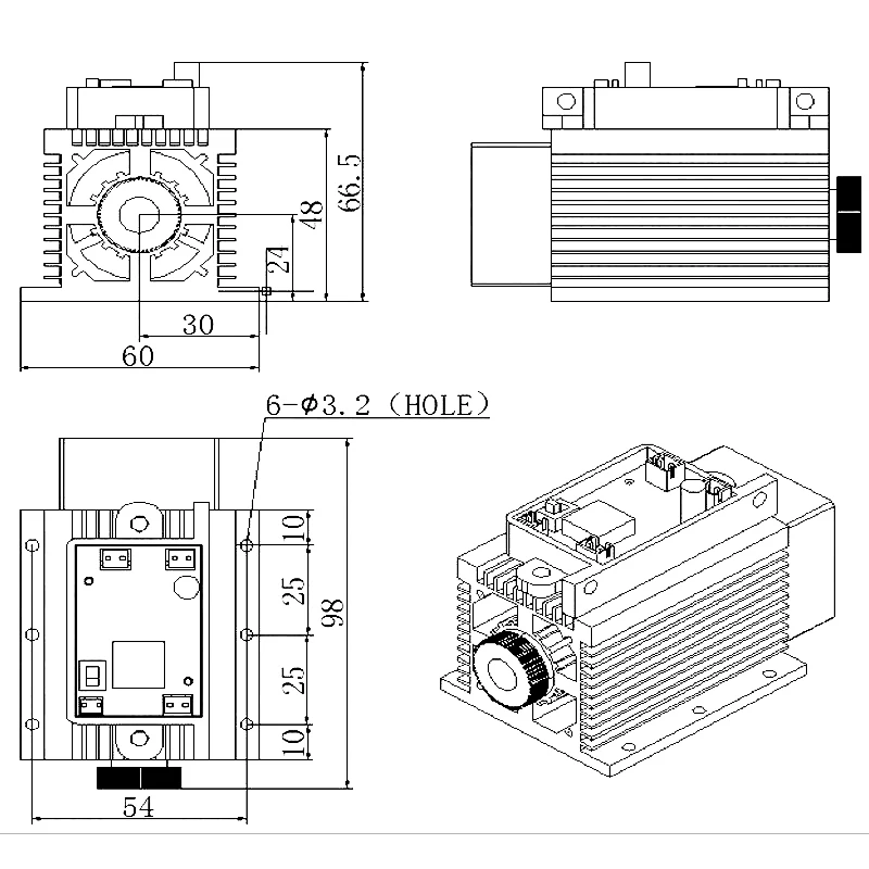 Модуль является мощным лазерным модулем и с фокусируемые линзы может регулировать фокус, выводить как поперечный луч, так и коллимированный луч.