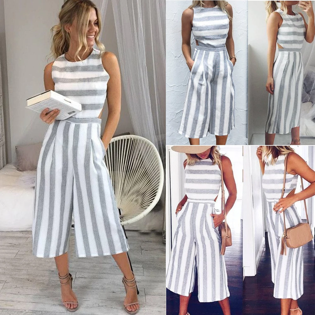 Комбинезон женский летний в Вертикальную Полоску, Модный повседневный длинный комбинезон без рукавов, с открытой спиной, одежда для девушек
