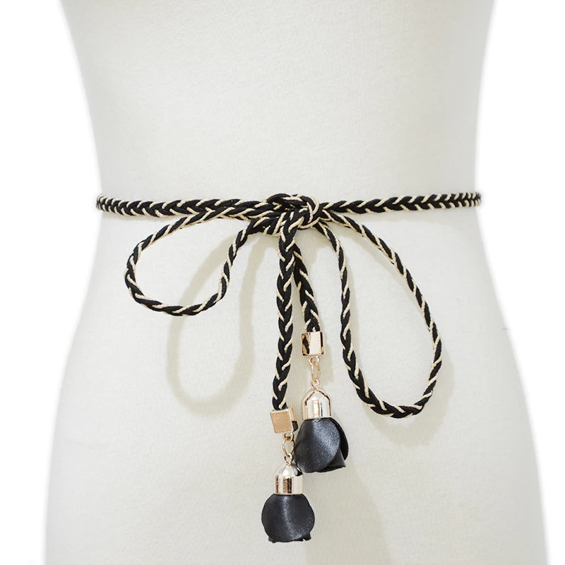 Женский плетеный пояс ручной работы, тонкий пояс с бахромой и цветком белой розы для платья, веревочная цепочка с бантом, Bg-643