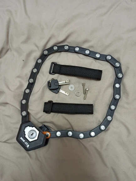 Очень удобная цепочка. Это не кажется очень сильным и является дополнением к другому более высокого качества. Занимает мало места, быстро складывается и снимается. Используется для переднего колеса и остальной части велосипеда с другой цепью более высокого качества. Время покажет, устойчив ли к ржавчине. За цену, которую вы стоили мне, я доволен покупкой!