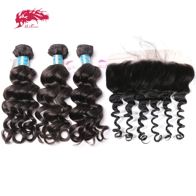 Али Королева волос перуанские натуральные волнистые человеческие волосы пучки с фронтальной естественным цветом 13X4 кружевной фронтальный с детскими волосами