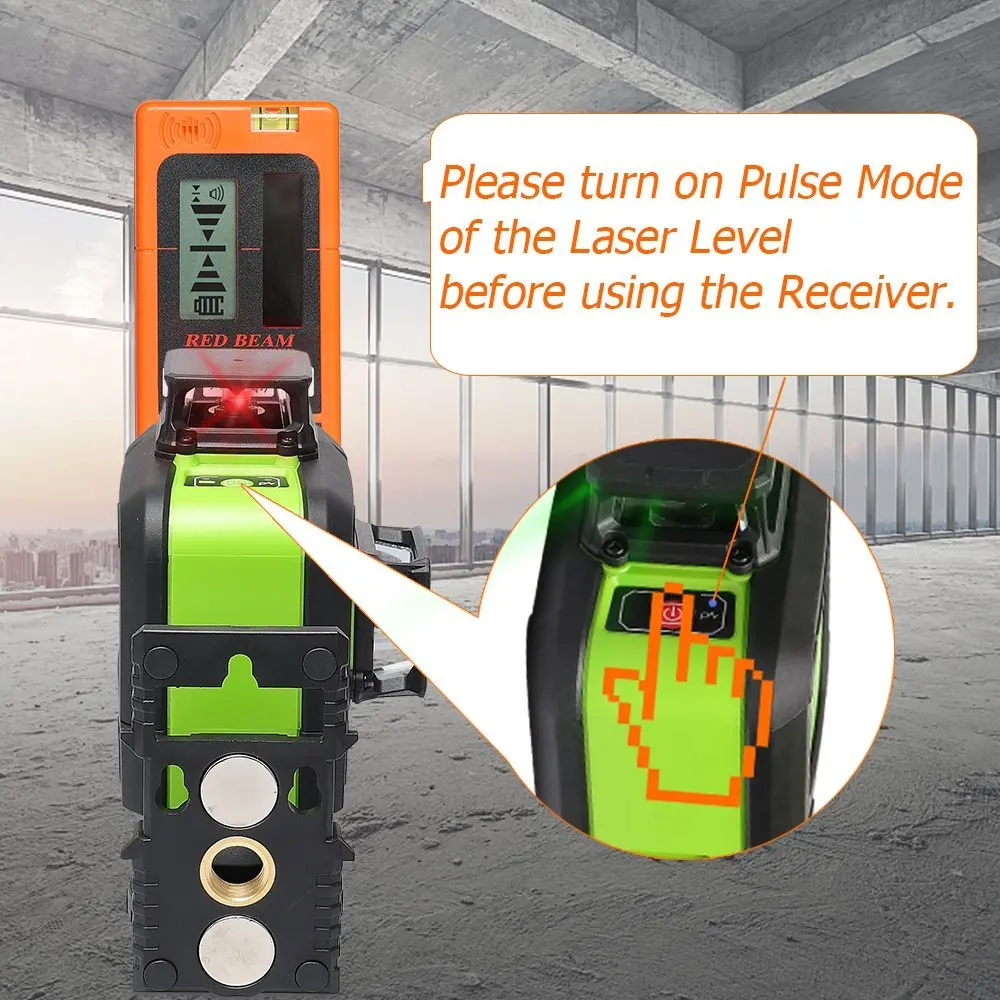 Импульсный режим:⏰Разблокируйте маятник, нажмите и удерживайте кнопку питания (около 5 секунд), чтобы включить импульсный режим, затем включите красный.⏰Когда требуется наружная работа (приемник необходимо приобрести отдельно, лазерный приемник LR510 может получать импульсы⏰Частота приемника составляет 10 кГц, а бренд Huepar-лучшее сопряжение.