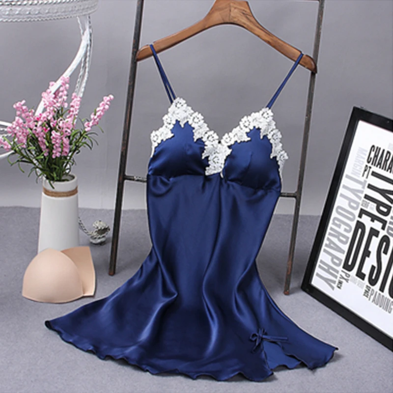 Женская шелковая ночная рубашка, кружевная ночная рубашка с V-образным вырезом и подтяжками в стиле пэчворк, 2018