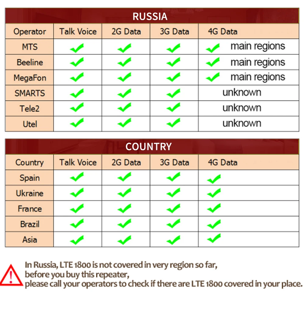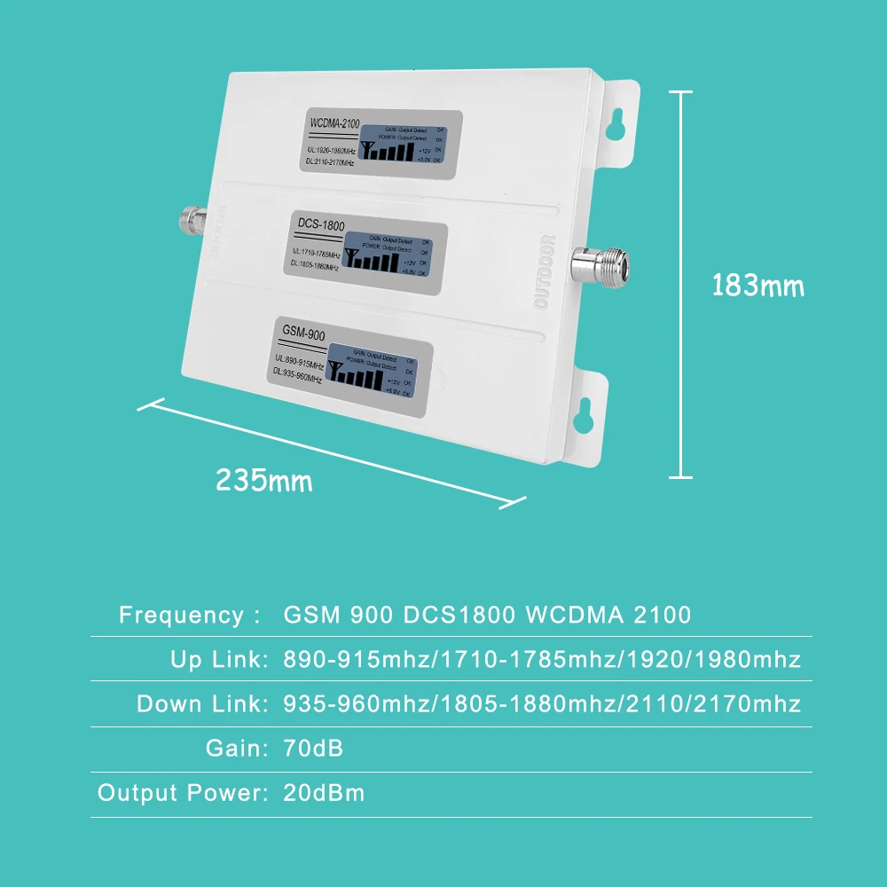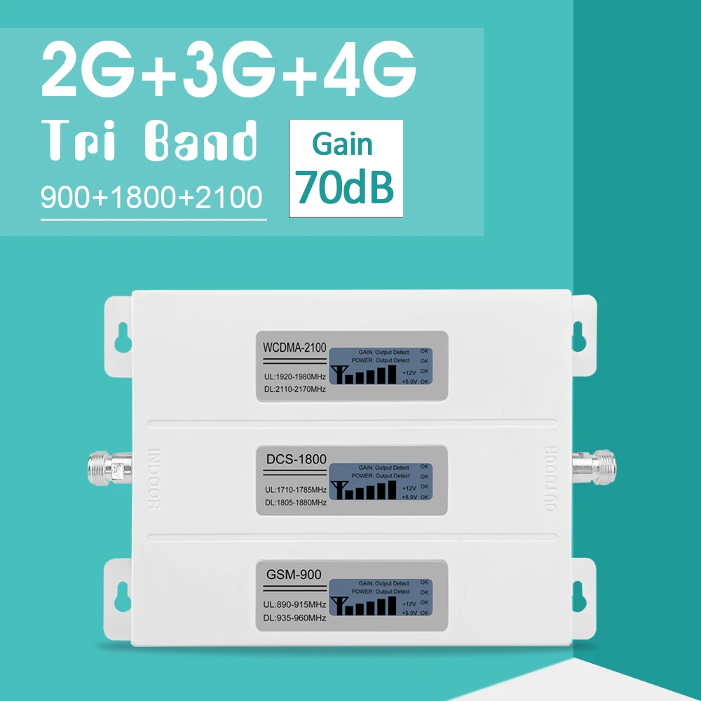 Boost. Усиление: Голосовая и 2G 3G 4G сеть. 【Лучший голос и дата 】получайте меньше сброшенных звонков, лучшее качество голоса, более быстрая загрузка и загрузка. Вы можете поделиться с вами приятным временем с помощью хорошего голосового звонка, и вы не беспокоитесь о том, что звонок неожиданно отпадет. ❷. Трехполосный ретранслятор сигнала: GSM 900 и DCS LTE1800[Band 3] и WCDMA 2100[Band 1]. ❸. Высокий коэффициент усиления: 70 дБ. Покрытие: 400 квадратных метров В1. ЖК-дисплей: Да. ❺. Подходит для: России, Испании, Франции, Бразилии, Европы и т. Д. ❻Гарантия: 1 год!