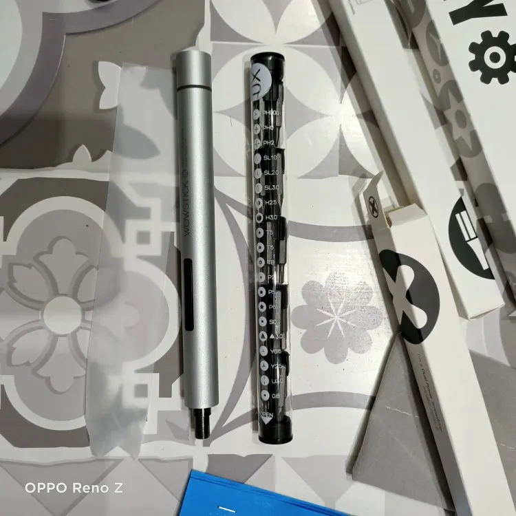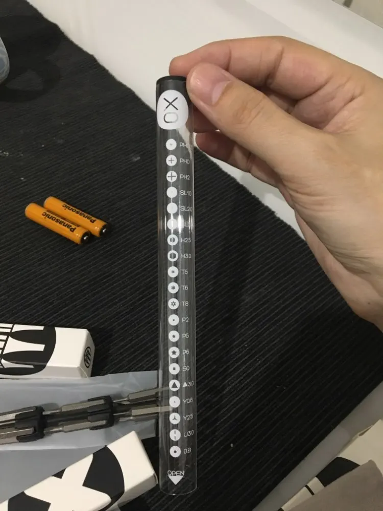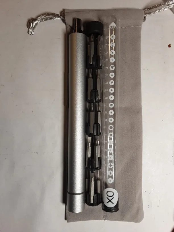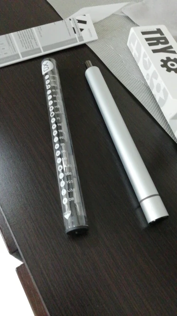 Пришло быстро, коробки как всегда немного мятые, внутри всё целое. Внешне выглядит прилично, набор из 20 бит в тубусе в комплекте, - и +, ну и в дополнение к уже привычным TORX есть довольно редкие Р2, Р5, Р6, S0, Y0.6 и Y2.5. Работает от 2 ААА (в комплекте нет). Момент затяжки не регулируется, по ощущениям не больше 2 Нм, скорее всего зависит от заряда батарей. Для бытовых целей в работе с чем-то мелким - норм!