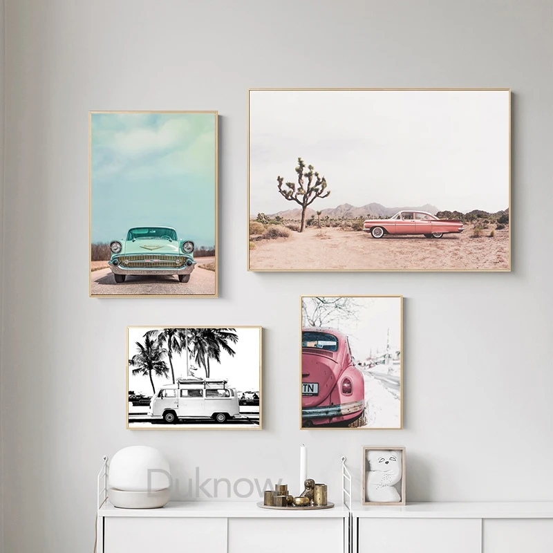 Винтажный постер для автомобиля, рисунок на стену в виде розового автобуса, художественная фотография, автомобильная Картина на холсте в стиле ретро, Настенная картина для гостиной, Настенный декор