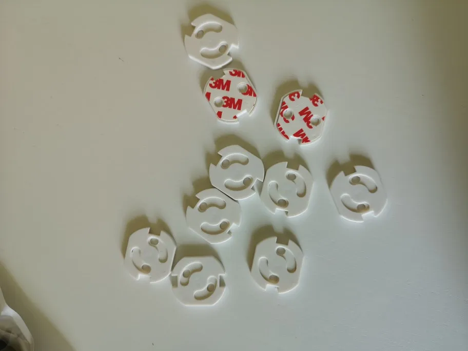 Накладки на двухстороннем скотче, неплохие, но некоторые после того как вытаскиваю вилку, не прячут отверстия в розетке