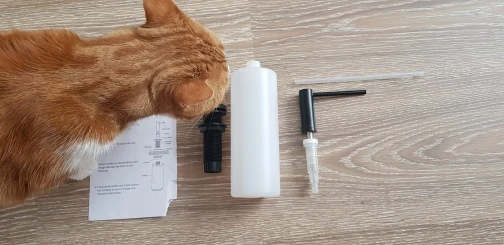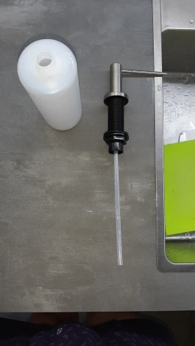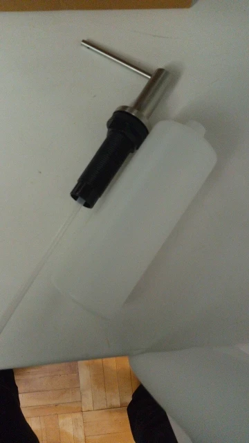 Дозатор хороший, но с доставкой что-то пошло не так. 2 месяца-это перебор. Буду удлинять трубку и пусть качает прямо из канистры под столом, в родную бутылочку устанешь заливать.