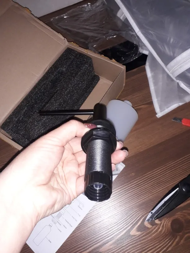 Товар полностью соответствует описанию. На вид добротный и качественный. Порадовал не только метал верхней части диспенсера, но и качество скрытой от глаз пластиковой колбы для моющего средства. Трек-номер заказа не отслеживался, но посылка была доставлена достаточно оперативно через СДЭК.