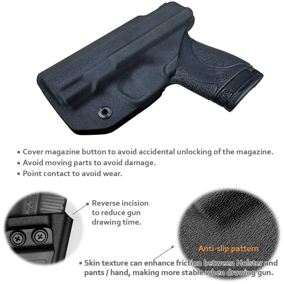 Наш щит Smith & Wesson M & P 2,0 9 мм. 40 S & W кобура IWB имеет систему удержания звука Posi-Click, и пистолет имеет четкий звук «щелчка», когда он вставлен, так что вы знаете, что ваш пистолет надежно сел. Поскольку время реакции имеет решающее значение для выживания, мы используем установочный винт для регулировки плотности, чтобы определить силу, необходимую для извлечения. Зажимы из нейлона и ремень из стекловолокна прочные и надежные, вы можете отрегулировать угол от 0 до 15 градусов в соответствии с вашими привычками, чтобы достичь максимальной скорости.
