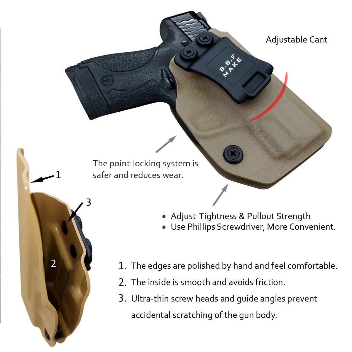 Кобура BBF сделана вручную из прочной 0,8 "KYDEX. Он не только водонепроницаем, устойчив к поту, но и обладает высокой прочностью, высокой вязкостью, ударопрочностью, устойчивостью к истиранию и старению. Можно использовать в различных условиях. Так что вы всегда можете полагаться на него, чтобы спасти свою жизнь.