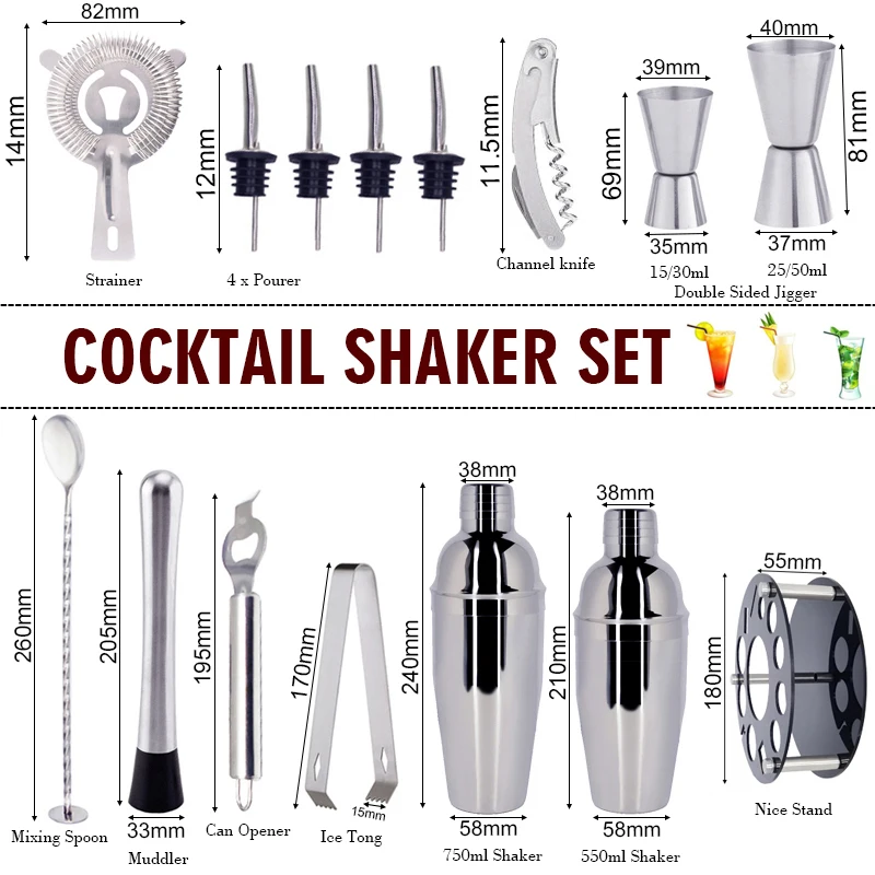 Набор для бармена, шейкер для коктейлей и вращающаяся стойка-держатель, 750 мл, 600 мл, 450 мл, 14 шт.