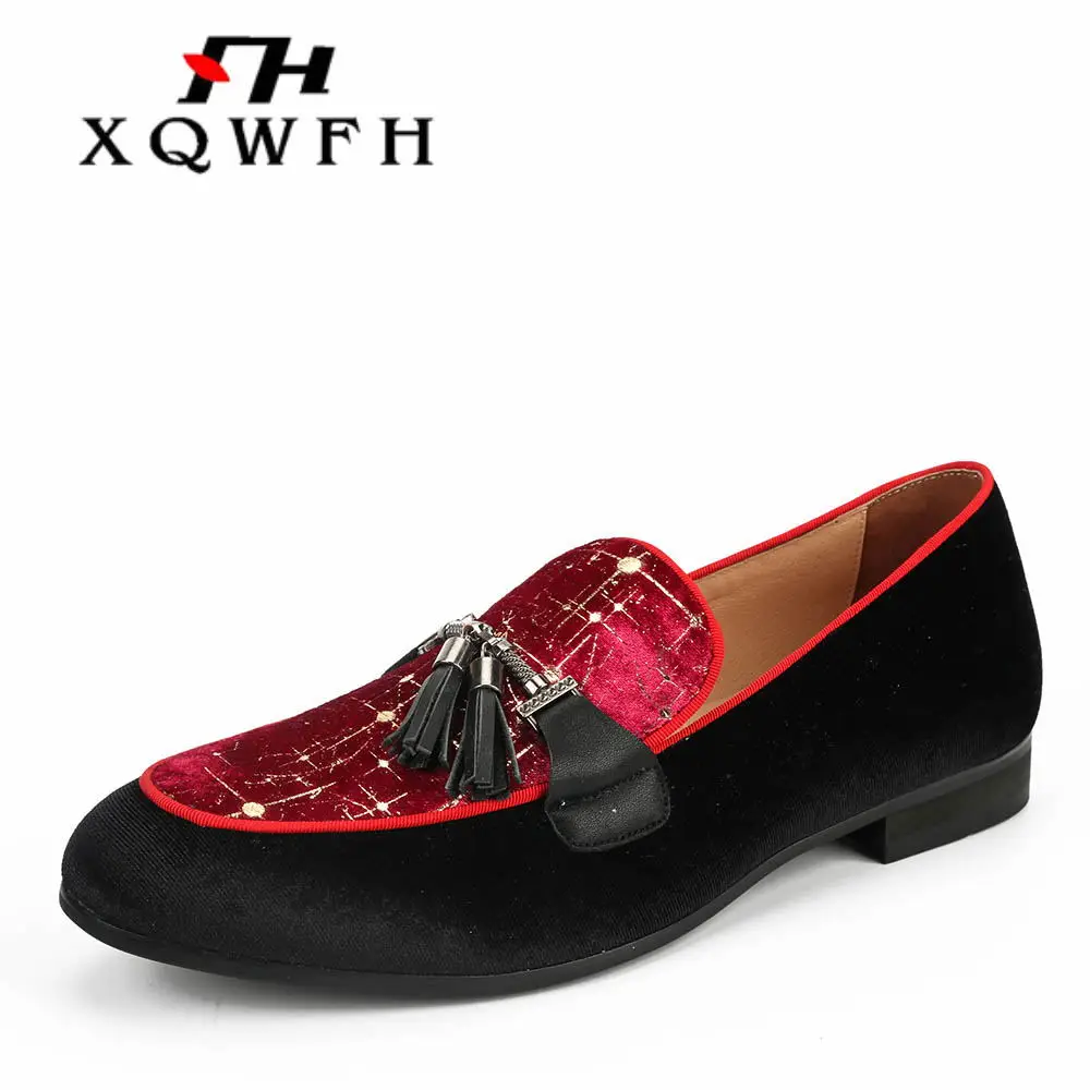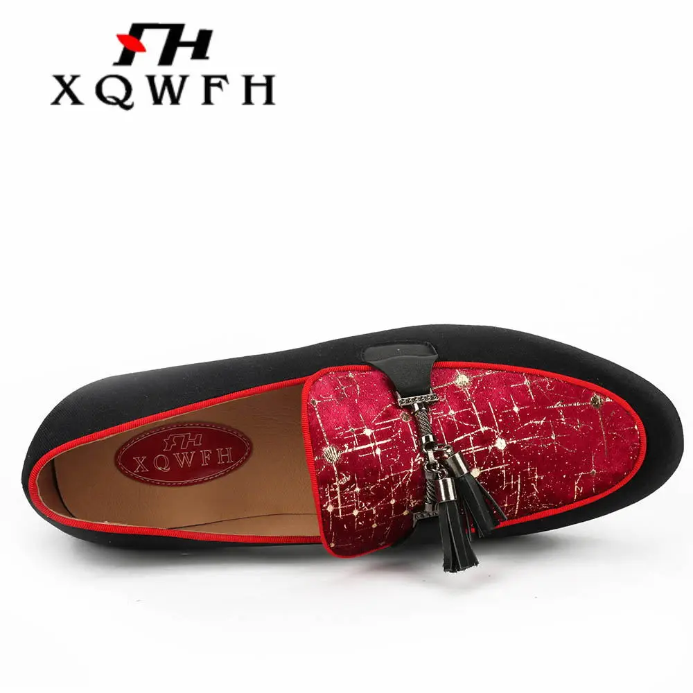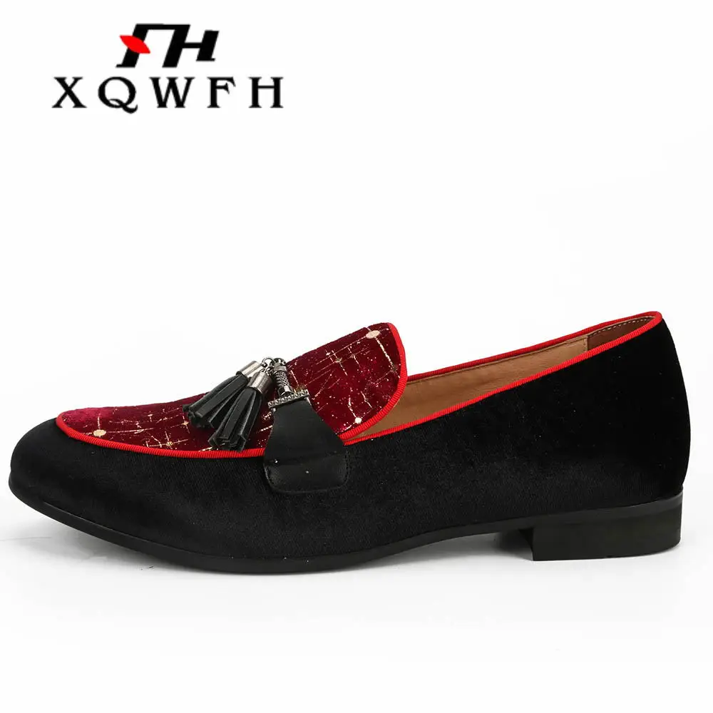 Черно-красные подходящие бархатные туфли XQWFH с бахромой под платье для свадьбы, вечеринки, банкета, мужские курительные туфли, лоферы, слипоны