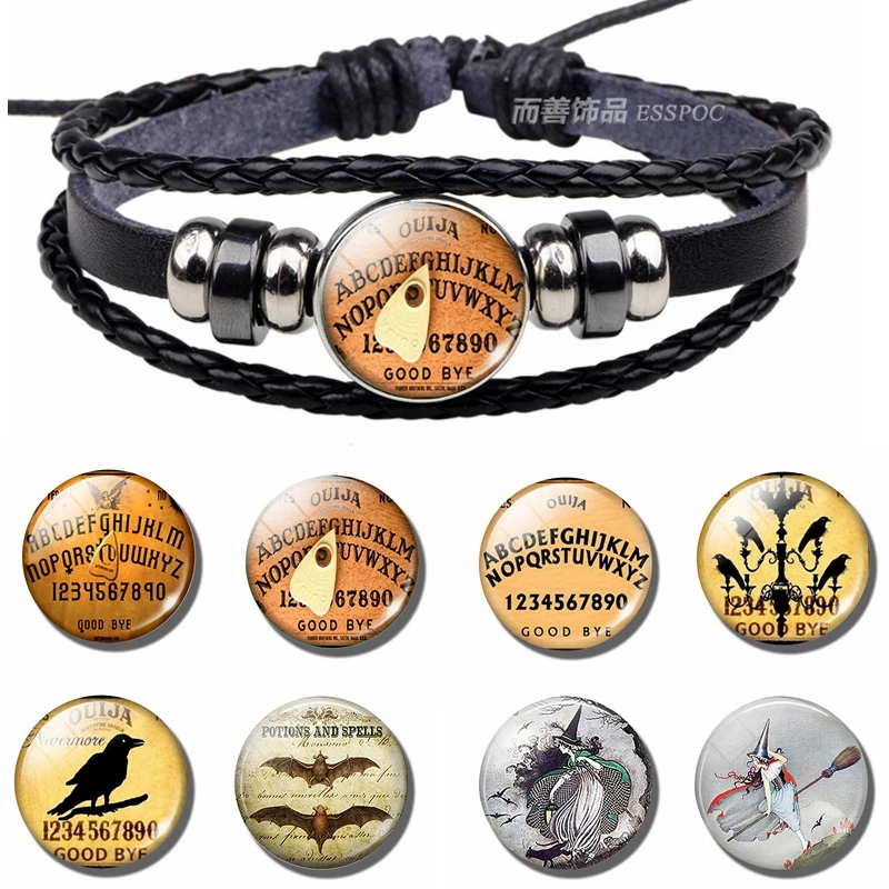 Плетеный кожаный браслет с черными пуговицами, винтажная доска Ouija, стеклянный кабошон, ювелирные изделия, подарок