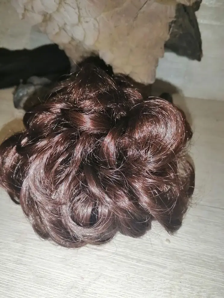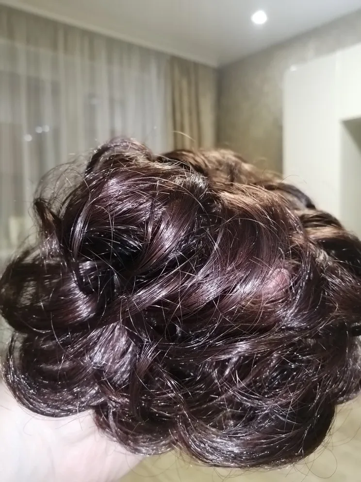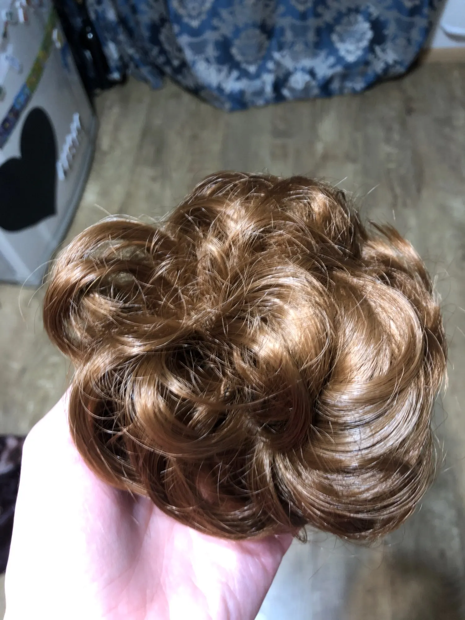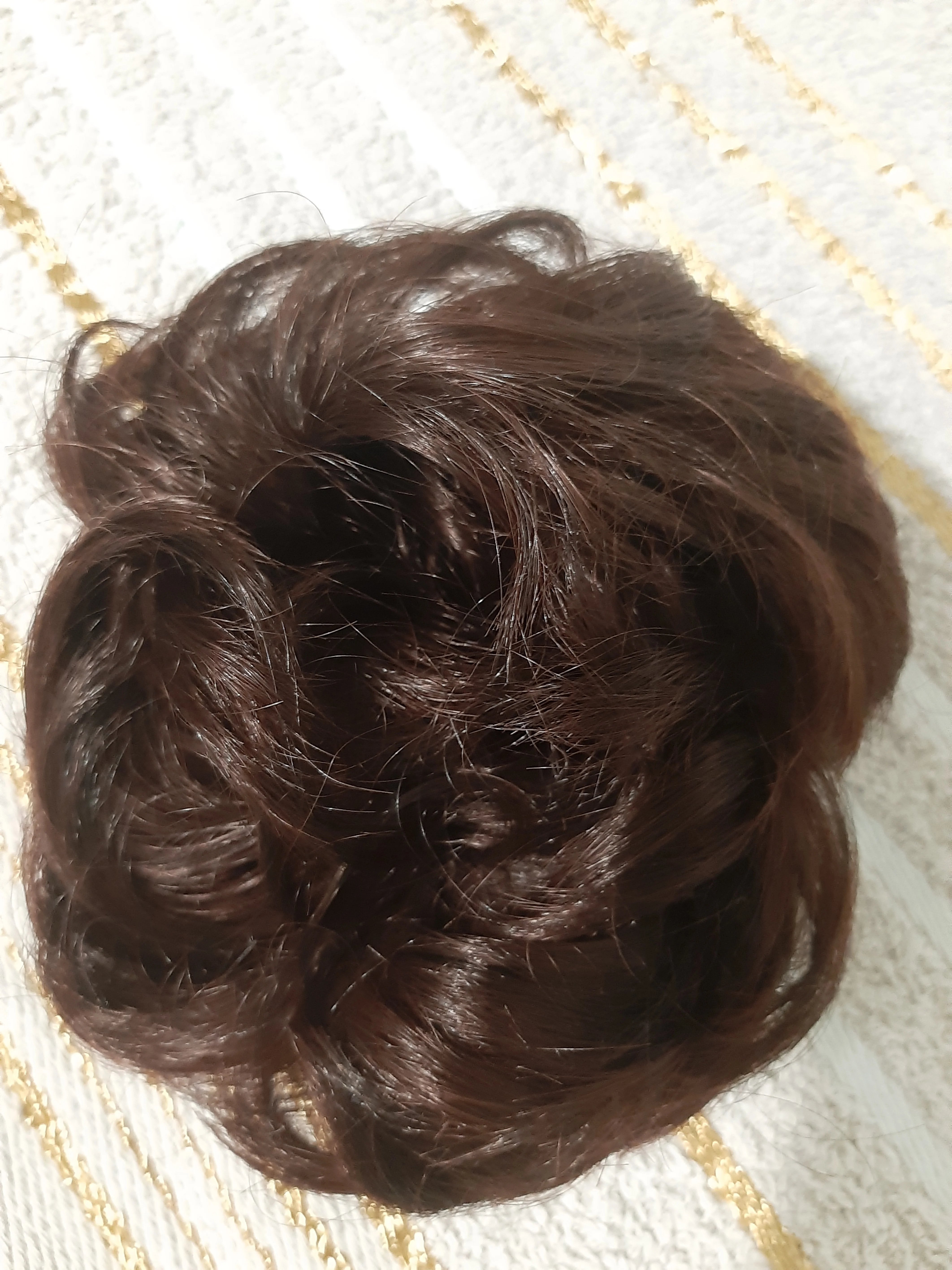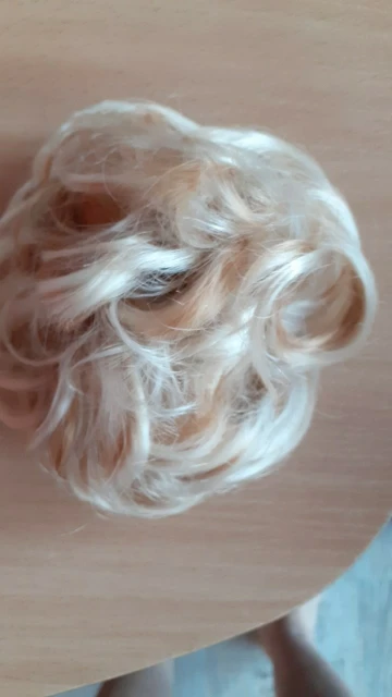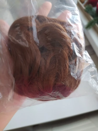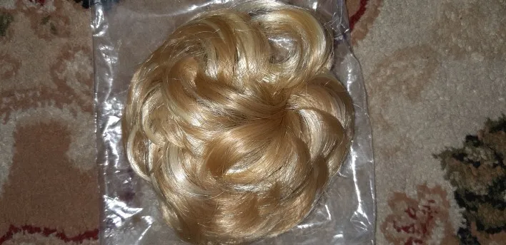 Посылка шла больше месяца. Пучок не такой объёмный, как на фото, но растрепать можно дополнительно. Понравилось, что не так сильно блестит, как кукольный. Есть запах, как от новой вещи, не токсичный. Резинка не очень эластичная, поэтому лучше волосы закрепить обычной резинкой, а сверху уже волосяной пучок. Смотрится хорошо!