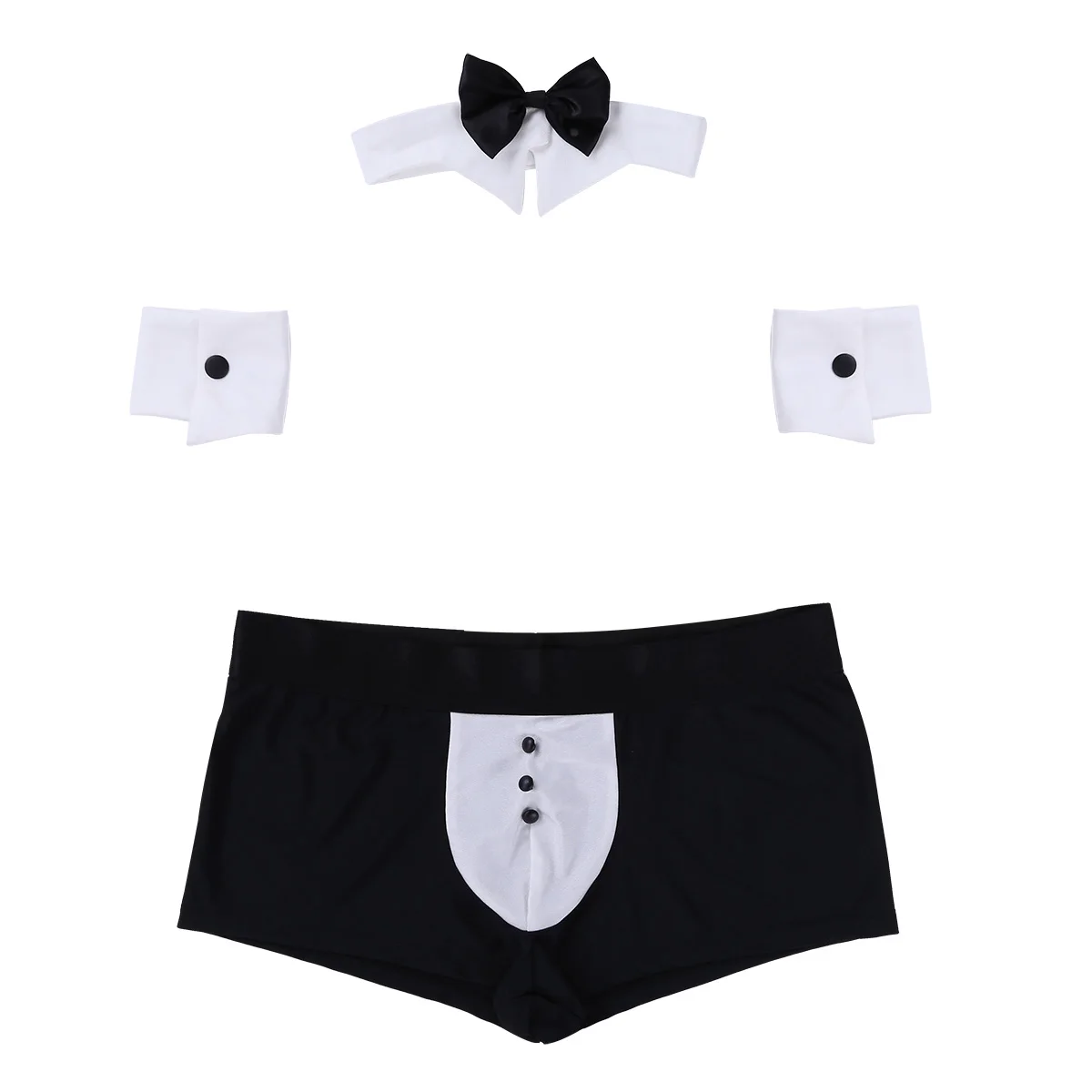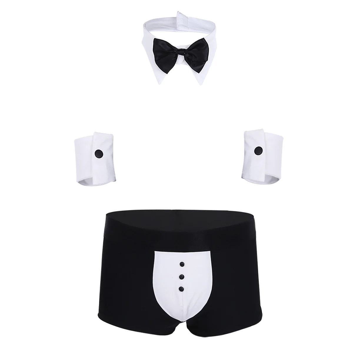 Особенности: Новинка, мужской костюм для смокинга, включает трусы-боксеры, одну пару браслетов и шею. Эластичный пояс с низкой посадкой, карман спереди с 3 пуговицами, открытые ножки. Воротник с черным милым бантом, застежка на крючок и петля; Браслеты с застежкой-молнией. Мягкий и удобный комплект, отлично подходит для ночного белья, сюрприза для сна, ролевых игр или самостоятельного использования. Пожалуйста, проверьте размер перед покупкой, ручная стирка в холодной воде, машинная стирка.