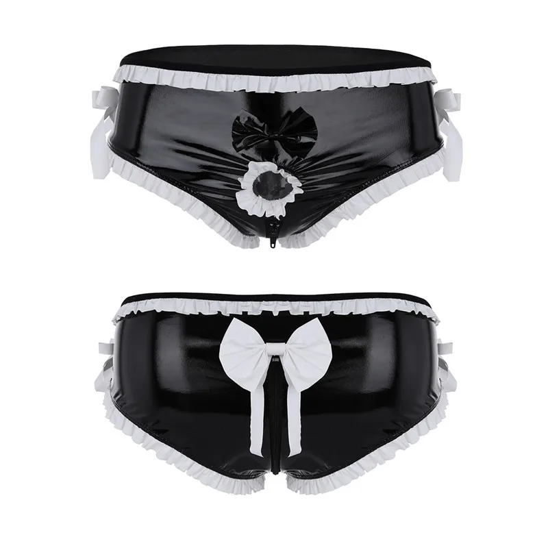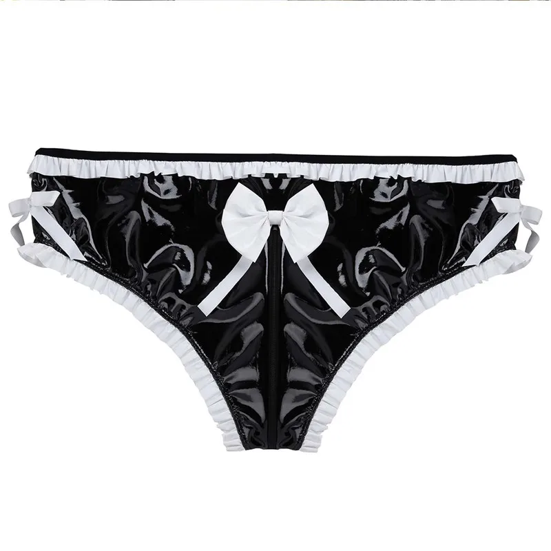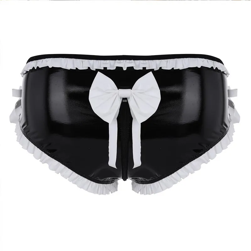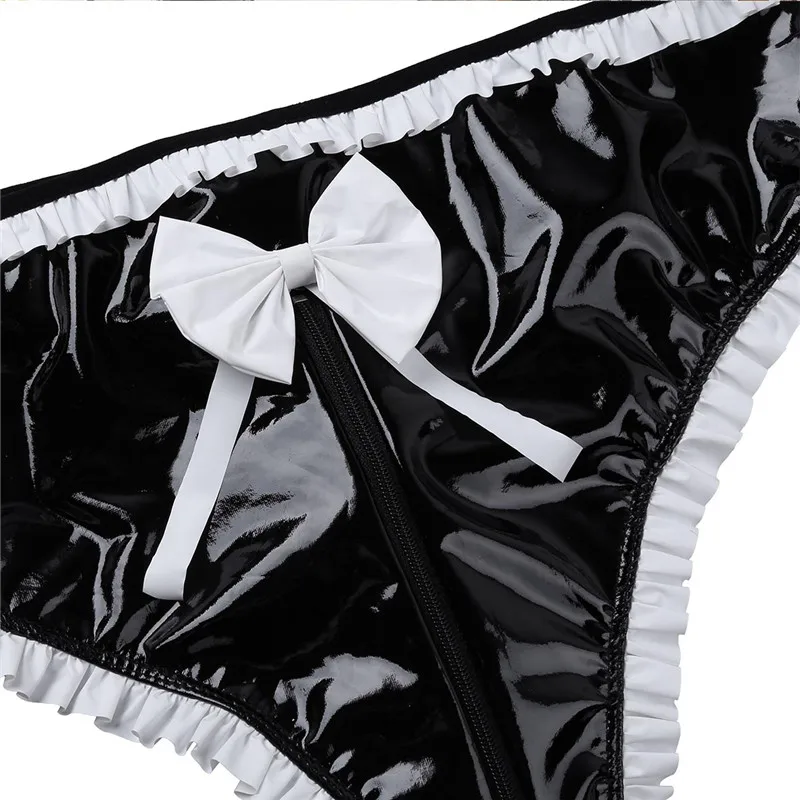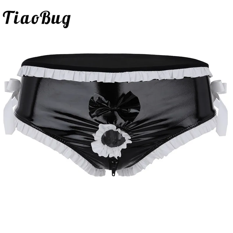 TiaoBug Мужское нижнее белье, блестящая искусственная кожа, открытая передняя часть, кольцо для пениса, оборки, бант, молния, промежность, бикини, трусы, горячее нижнее белье