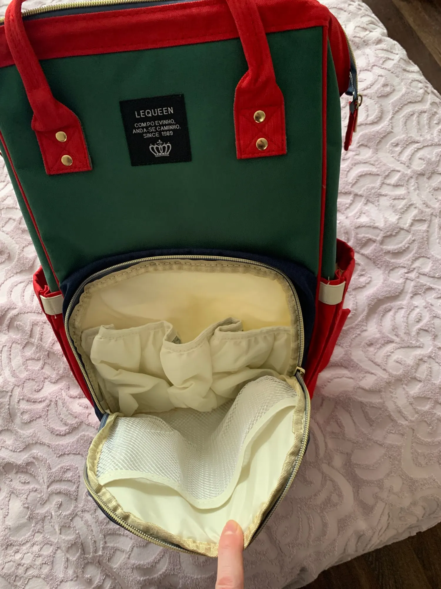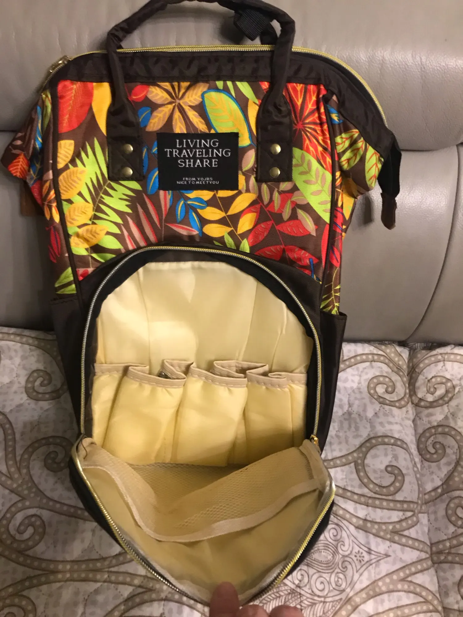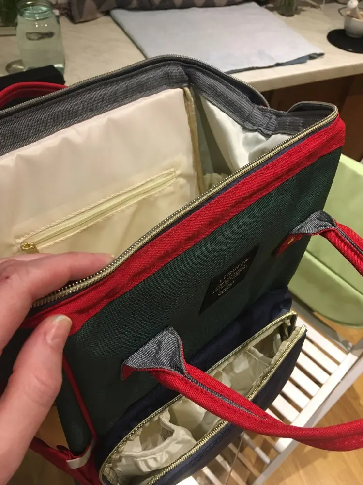Отличная сумка для мам. Много карманов, отсеков, штучек для бутылочек, памперсов, салфеток. Удобные ручки. Брала в синем цвете под коляску - очень красивый глубокий цвет. Для того, чтобы крепить к ручке коляски, можно было использовать имеющийся ремешок с кнопкой на верхних ручках, но мне он показался ненадежным и я купила за 149р на Вайл*дбер*риз ремешки с карабинами для крепления за имеющиеся на рюкзаке металлические колечки.