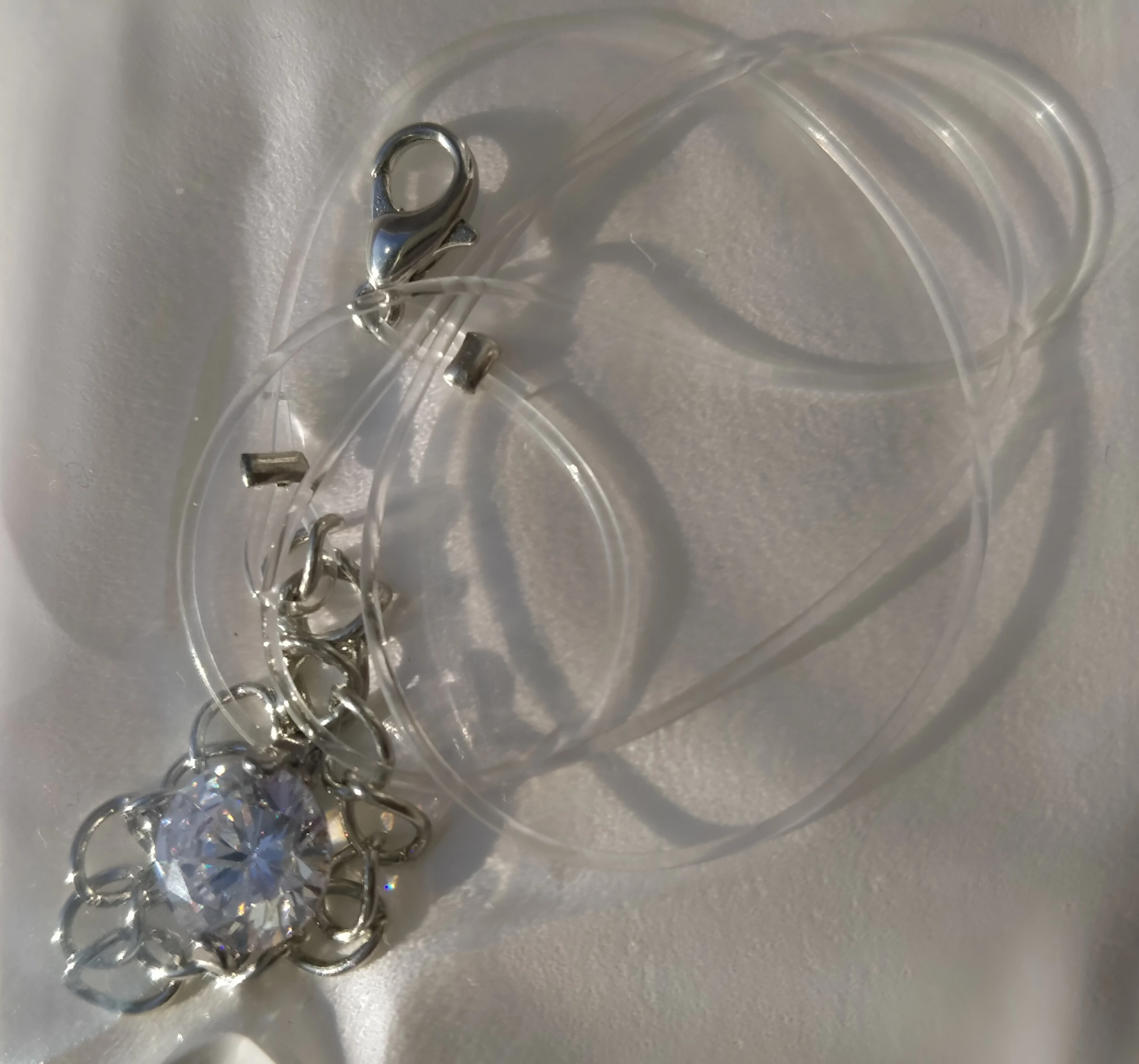 шарик ( наш бриллиантик ) довольно таки большого размера, видно из далека,сделан качественно, на солнце блестит. Верёвочка - силиконовая, прозрачная,ее почти не видно. Цепь ( застёжка) довольно таки большая,нужно следить за тем,чтобы не перекрутилась. Она вроде крепкая,у меня ещё не ломалась.