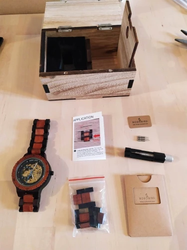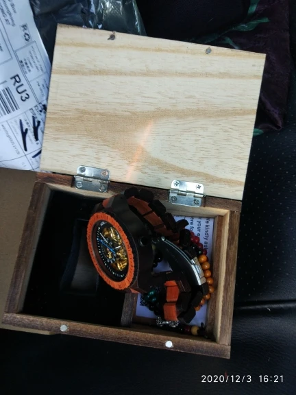 приехало чуть меньше, чем за месяц в Якутию :) часики в фирменной коробочке, в комплекте была штучка для звеньев, чтобы можно было самому уменьшить или увеличить ремешок, плюс два звена дополнительно :) часы и ремень из дерева)) идут пока точно, заводятся с тихим звуком трорр брали папе в подарок- он сказал, что очень доволен и ему понравилось :)) спасибо!