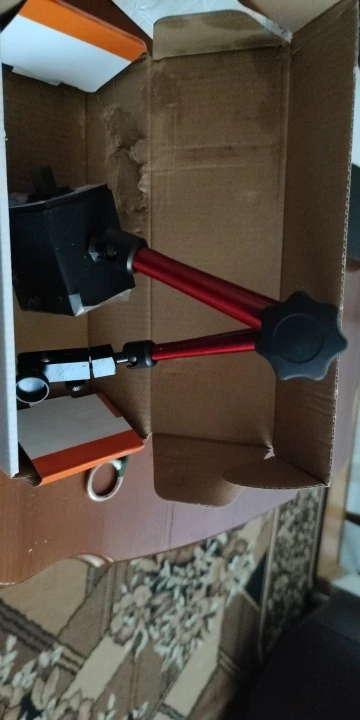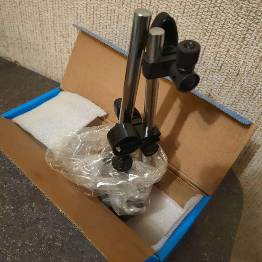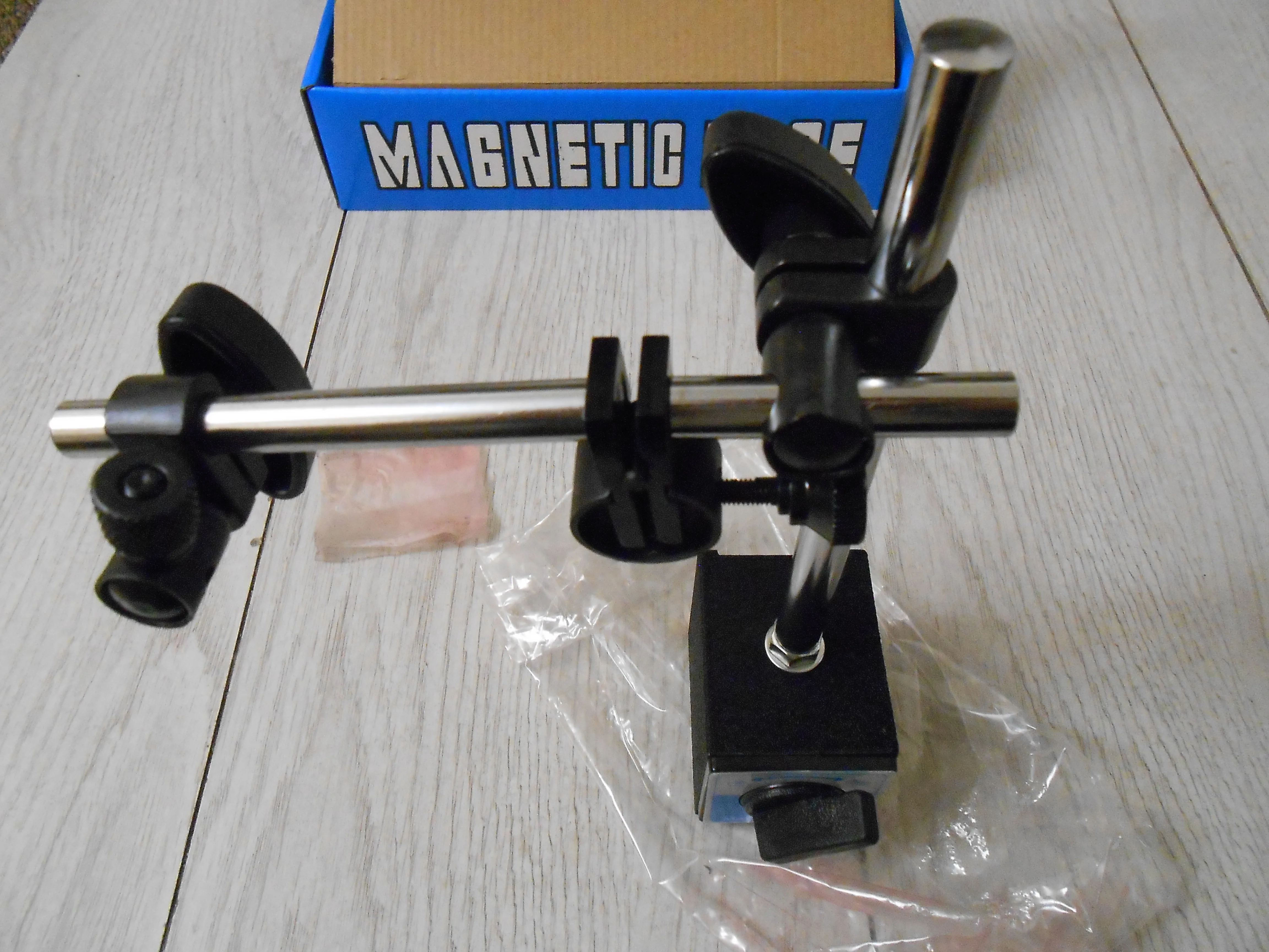 Получил на почте в Зеленограде через 5 дней после заказа. Стойка массивная, почти полтора кило. Производит впечатление качественной вещи. Магнит не супер мощный, но держит крепко даже на холодильнике. Есть крутилка плавной регулировки. Думаю, для не совсем проф применения пойдёт на ура.
