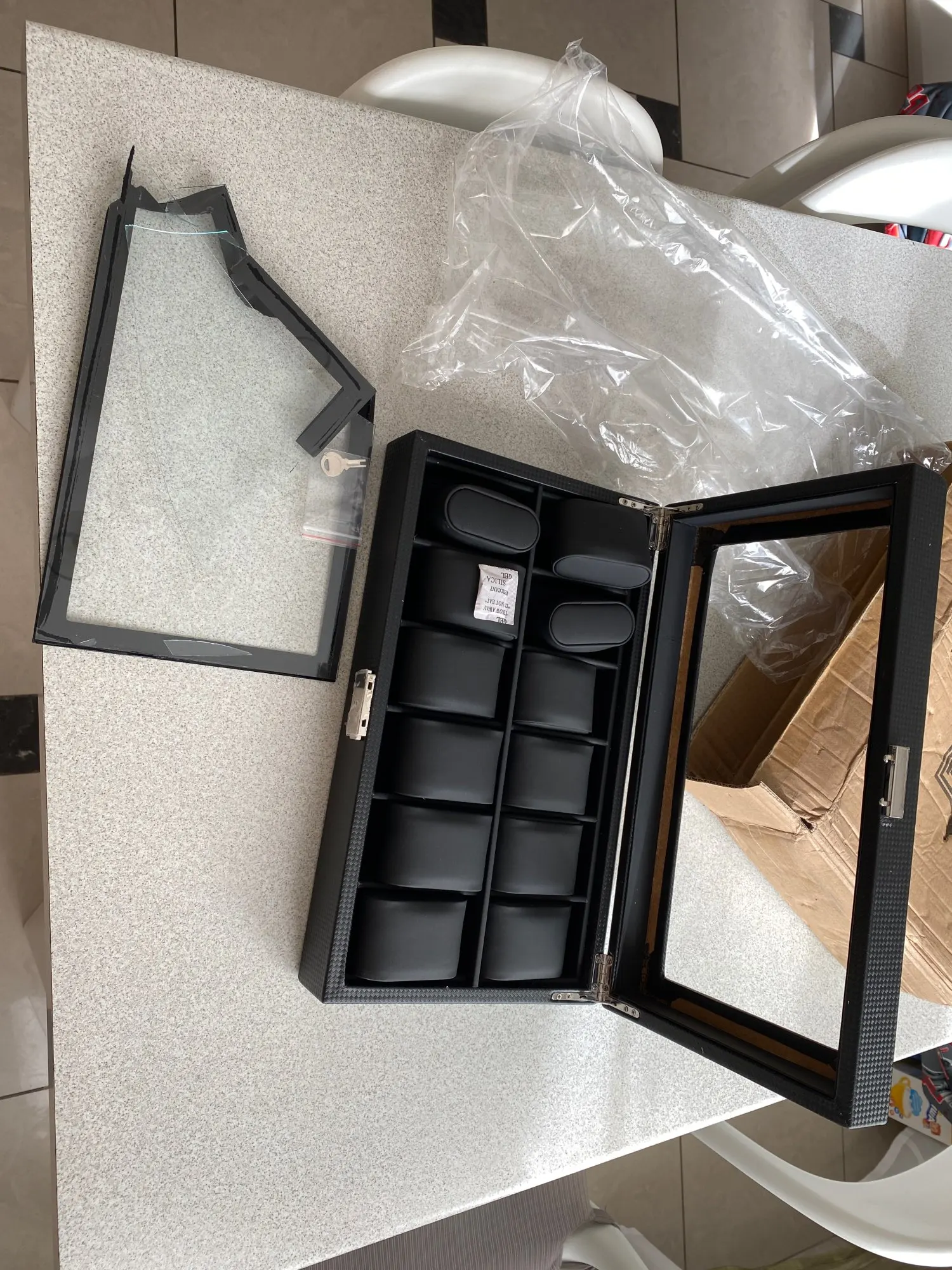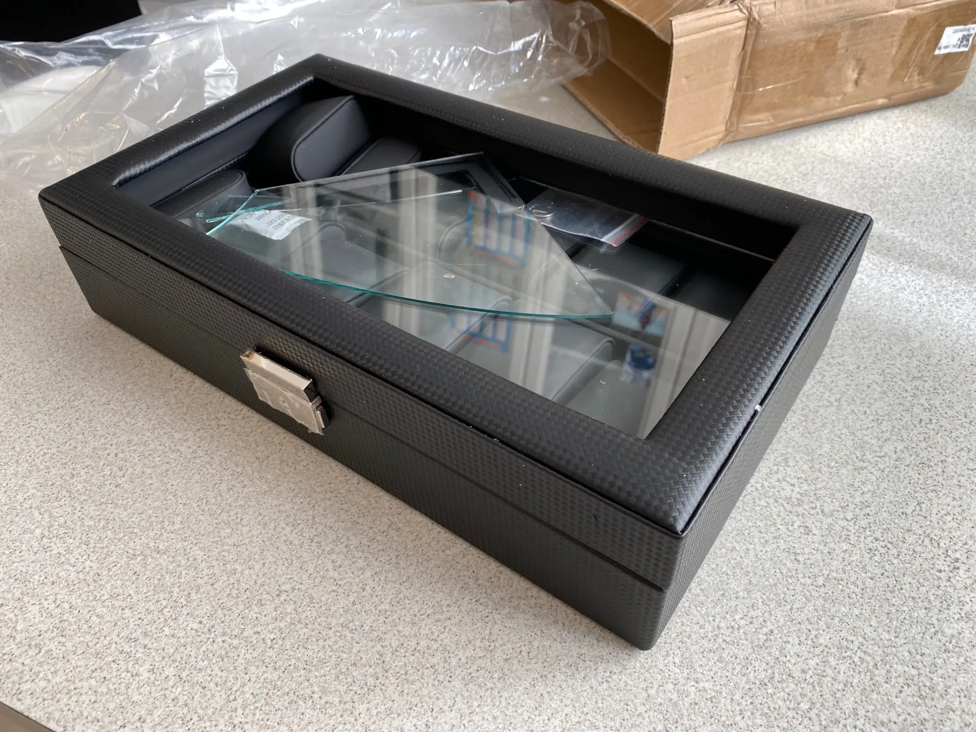 Качество шкатулки очень даже не плохое. Ролики для браслетов мягкие. Искустенное покрытие шкатулки из виниловой пленки под карбон. К сожалению пришло с разбитым стеклом:( теперь придется реставрировать. Стекло очень тонкое 2 мм.