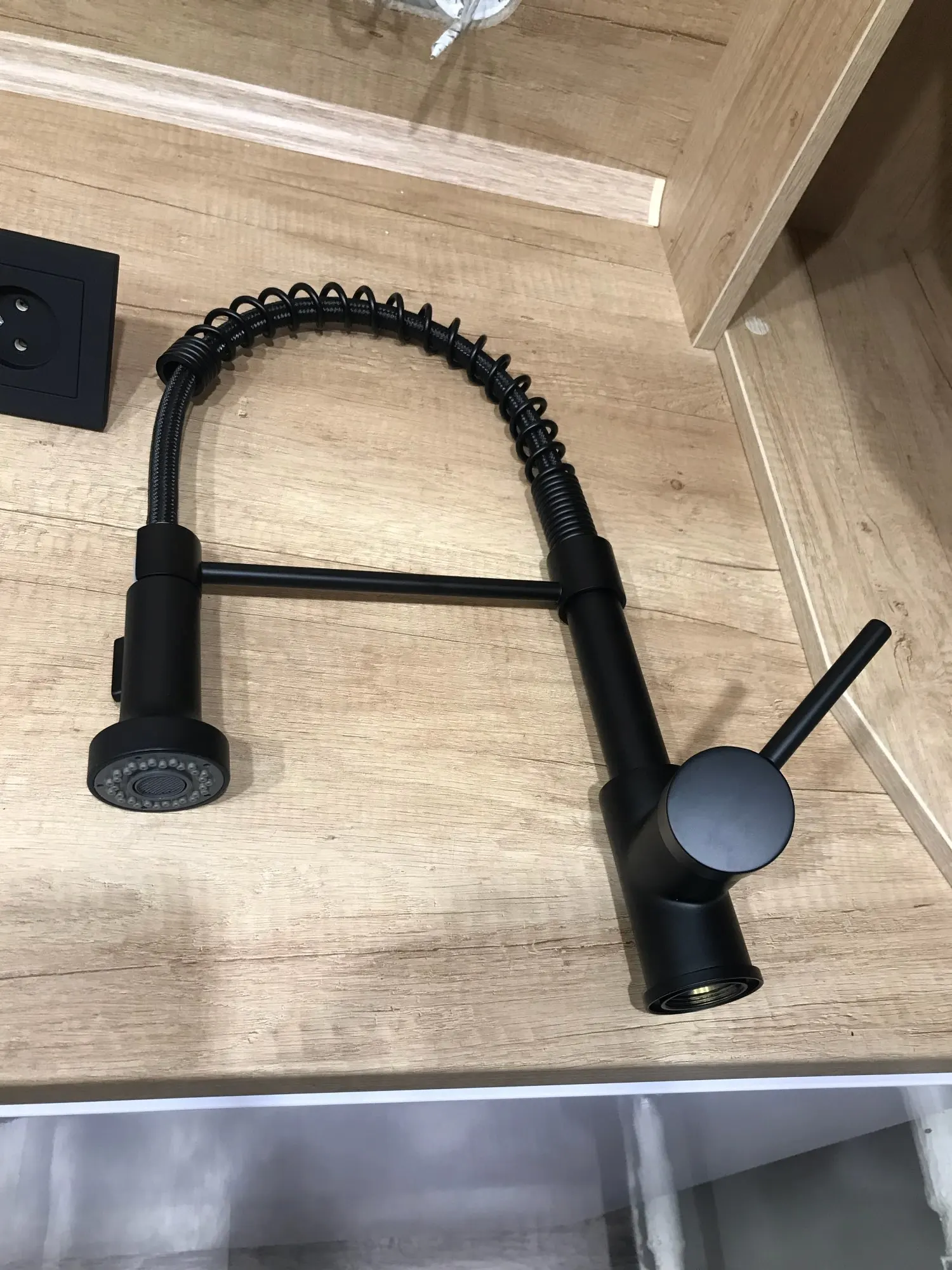 Смеситель на вид качественный. Вес в коробке — 2 кг, вес самого смесителя — 1,2 кг. Для сравнения, простенький Лаган из Икеи весит 700 гр, так что, с учётом разницы в размерах, думаю, что вес адекватный. Снизу видно желтоватый метал. Не смотря на качество изготовления, оказался неудобным. Понял я этого уже после установки, иначе воспользовался бы бесплатным возвратом. Держатель лейки через чур короткий и расположен слишком низко. При мытье посуды приходится тянуться достаточно далеко, чтобы попасть под струю воды, а если посуды много или она высокая (кастрюли например) напрягает низкое расположение лейки. Как вариант, можно снять лейку с держателя, чтоб она свободно висела в воздухе, но тогда появляется вероятность случайно залить все вокруг в том числе себя — не критично, но неприятно. Струя воды узкая и достаточно мощная, показалось, что более концентрированная, чем у старого смесителя.