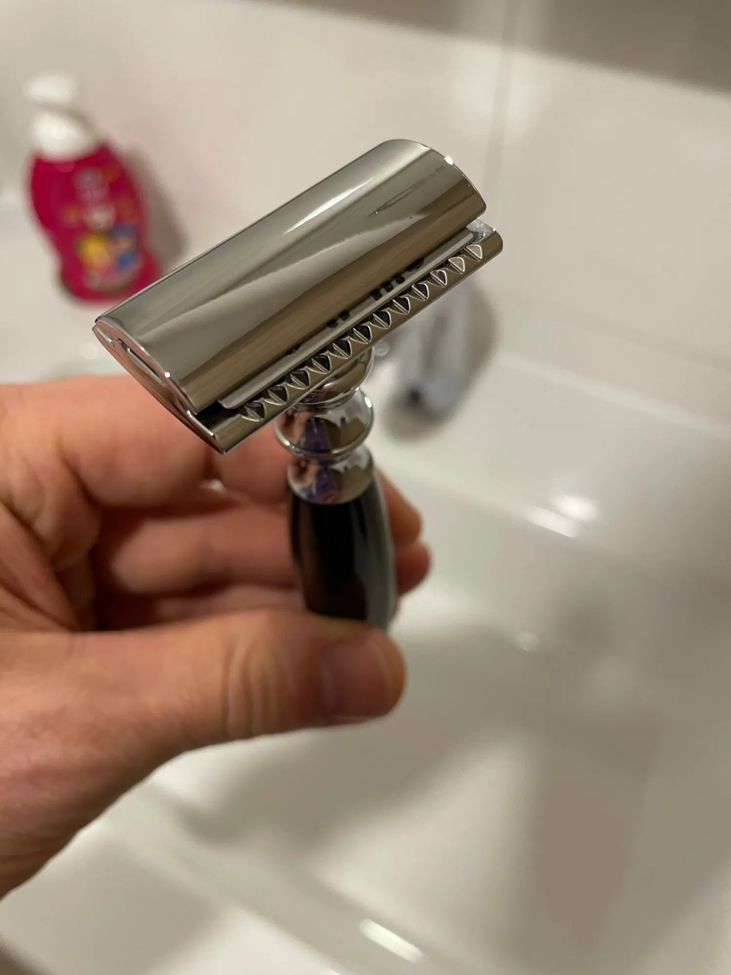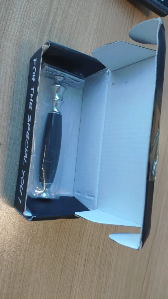 Продавец отличный, пришло очень быстро. А вот станок так себе. Красивый,, ручка немного скользкая но достаточно удобная. НО лезвие ровно не встает. Отверстия больше шпиньков и верхняя плита гуляет. И лезвие вибрирует, из за этого плохо бреет.