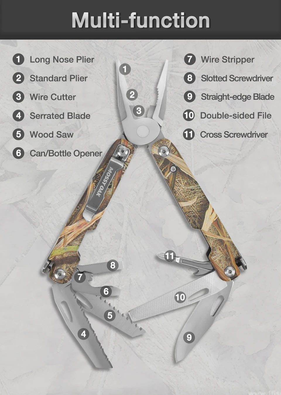 Многофункциональный инструмент MOSSY OAK, многофункциональные плоскогубцы 12 в 1, резак для проводов, многофункциональные инструменты, инструмент для выживания, кемпинга, рыбалки