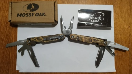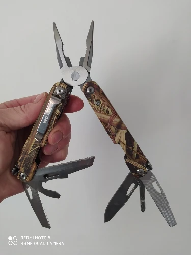 Заказ доставлен компанией IML. Оригинальная коробка без повреждений. Сам мультитул оказался немного крупнее чем ожидал. Относительно качества изготовления впечатление двоякое. Вроде все качественно, но некоторые "штуковины" бесполезны - видимо воткнули чтобы место не пропадало. Например не представляю задачу которую можно решить "пилой" которая входит в состав этого комбайна. Теоретически ей можно отпилить что то очень маленькое т.к. размеры "пилы" совсем никакие. Как мне кажется - пользу принесут плоскогубцы, нож и отвёртки. Может быть будет полезна штука напоминающая весьма сомнительного качества напильник/надфиль. Итого: К качеству изготовления претензией нет за эту цену. Ощущения от покупки: Вроде и получил что хотел вкупе с бесполезными "вставками".