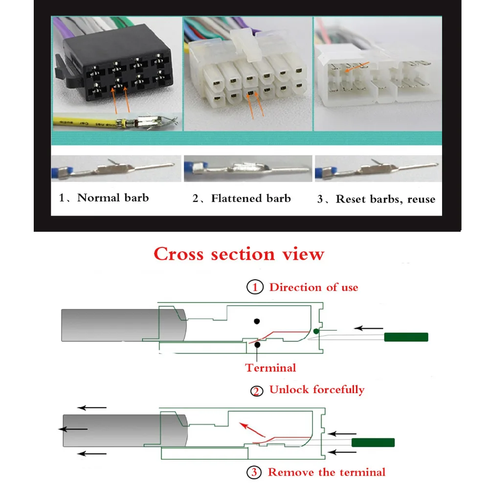 Прост в использовании. Только нужно нажать этот инструмент в клемму и вытянуть клеммные контакты без повреждений. Пожалуйста, не нажимайте клеммы с этим набором.